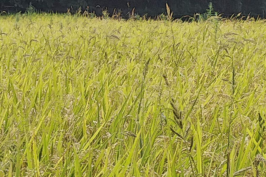 以前、収穫前にシェアホースアイランドさんの田んぼを実際に拝見したことがあります。馬糞堆肥のみで育てた稲は、背丈は低いですがしっかりと直立していました。化成肥料を使った田んぼの稲は、背丈が高く、そのため少し倒れていました。