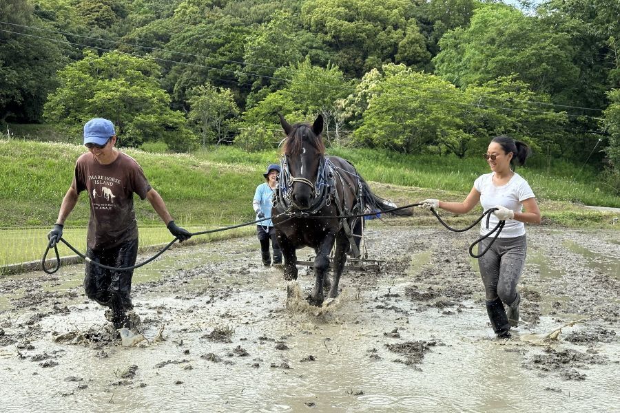 3頭の馬たちが栽培に協力しています。馬糞の堆肥はとても優れた土壌改良材になります。農耕馬の風ちゃんが田んぼを耕しています。