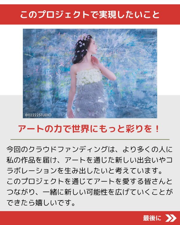 こんにちは!先日ご支援者様各位には直接メールでお礼のご挨拶させて頂きましたが、こちらをご覧頂いております皆様へ改めましてクラウドファウンディング無事に終わりました事をご報告させて頂きます。ご支援者様にメールをし終わった後、どのタイミングでこちらの活動報告としてあげるのか微妙になってしまい遅くなってしまいました、、(汗また目標には届かず大変申し訳ありませんでした、、ご協力して下さっている方々に嬉しい報告をお届けしたかったのですが、力足らずでした..。知らない方々への告知は、各種snsで広告やら様々な媒体の方にご協力頂いたりとメールだけではない形で出しておりました。賛同してくださる方、ポジティブなご意見ご興味を頂けたりとしたのですが、協力したい!支援したい!体験したい!とまでの気持ちにさせられなかったのは私の力不足だったなぁ、、と反省しております。ですがここでおわりではなく、一つずつ次の行動に歩みを進めております。次はもっと知らない方にも興味を持って頂ける形で届けられたと考えております。日本国内、そして海外の方へ、、と。本当に自分のアートに共感してくださる方々へ、きちんと私のやっていること、やりたい事が伝わる様に。(得意ではないのでやはりハードルは高いですが...)‥(汗そして現在、各種リターンの返送の準備中でございます。アート雑誌につきましては、現地発売日以降になると思いますので、6月末もしくは7月以降になるかと思います。少し時間が空いてしまいますが今しばらくお待ちくださいませ。また、今後の活動報告はご支援者様を優先させて頂く為にクローズドにさせて頂きます。申し訳ございません。この度は本当に様々な形でご協力くださいました皆様、誠に有難う御座いました!!ASUMI
