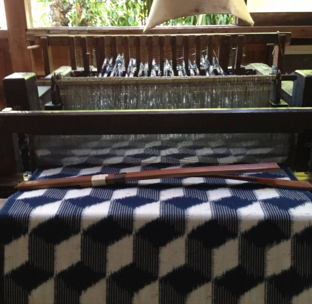 久留米絣は、昔ながらの投杼機(なげひばた)を用いて、一つ一つ丁寧に手織りされています。織りの際に絣模様を正確に合わせるには、高度な技術が求められ、職人の長年の経験が必要不可欠です。