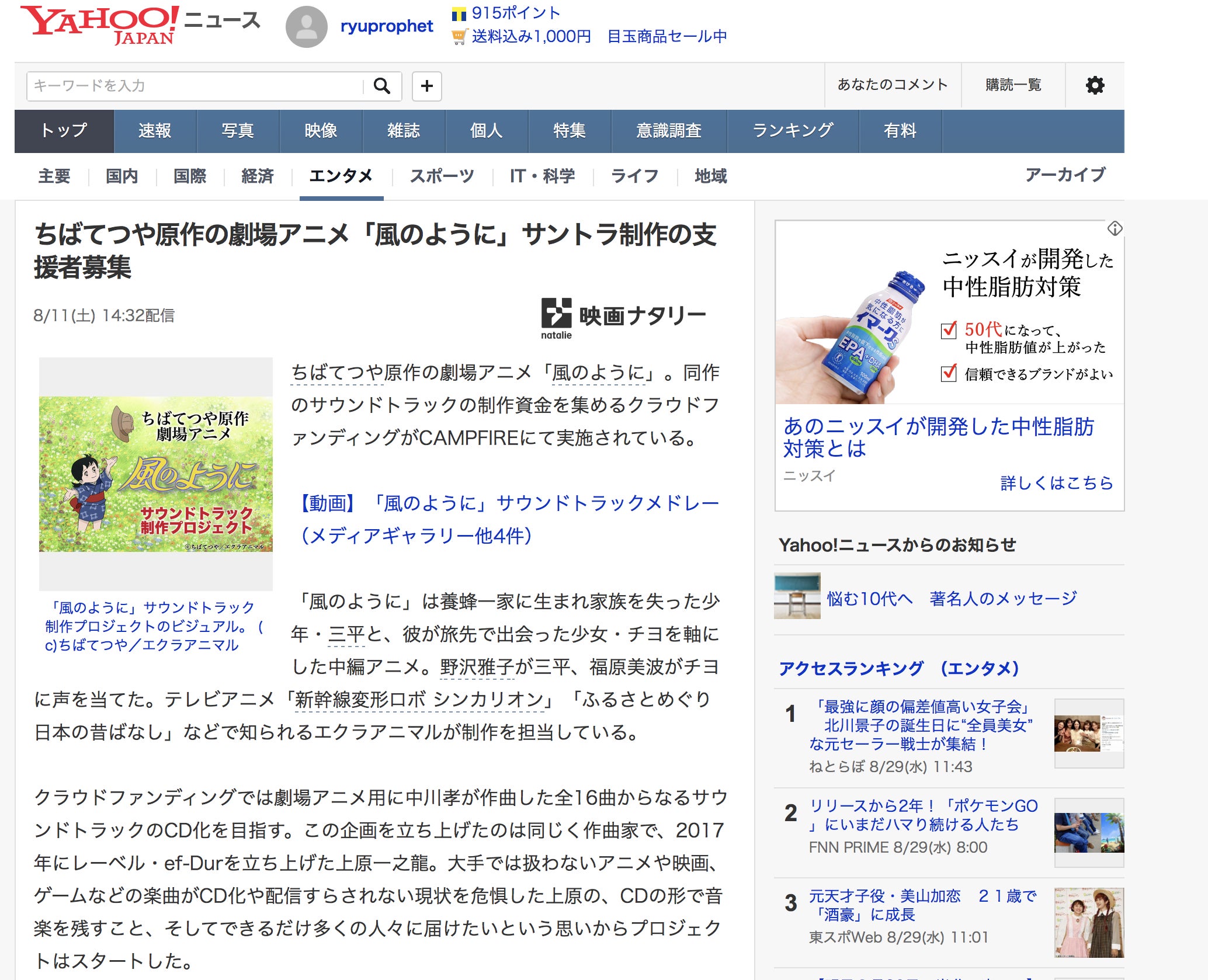 コミックナタリー、Yahooニュース、マイナビニュース等にプロジェクトが掲載されました。 https://natalie.mu/comic/news/295135 https://headlines.yahoo.co.jp/hl?a=20180811-00000024-nataliee-movi https://news.mynavi.jp/article/20180812-677648/ https://news.mynavi.jp/article/20180812-677648/ 基本的にはコミックナタリーさんの記事が転載されている形ですね。プロジェクトの記事を踏襲しつつさすがにライターさんが各書く記事はうまいですね。かなり引き立ててもらった感があります。 プレスリリースはこちらです。 https://www.value-press.com/pressrelease/206936 プロジェクト終了まであと10日です。 野口先生、本多先生のサイン入り色紙・アナザージャケット原画(複製)コースも枠があります!本編をまだご覧になってない方とご覧になった方用にDVDがある、なしのコースも分けてあります。本編をご覧になった方はこれを機に音楽とセットで鑑賞してくださいませ。カレンダーの中身を見ながら音楽を聞くのもお勧めです! このままではマイナスになってしまいます・・・引き続きご支援の程よろしくお願いします!!