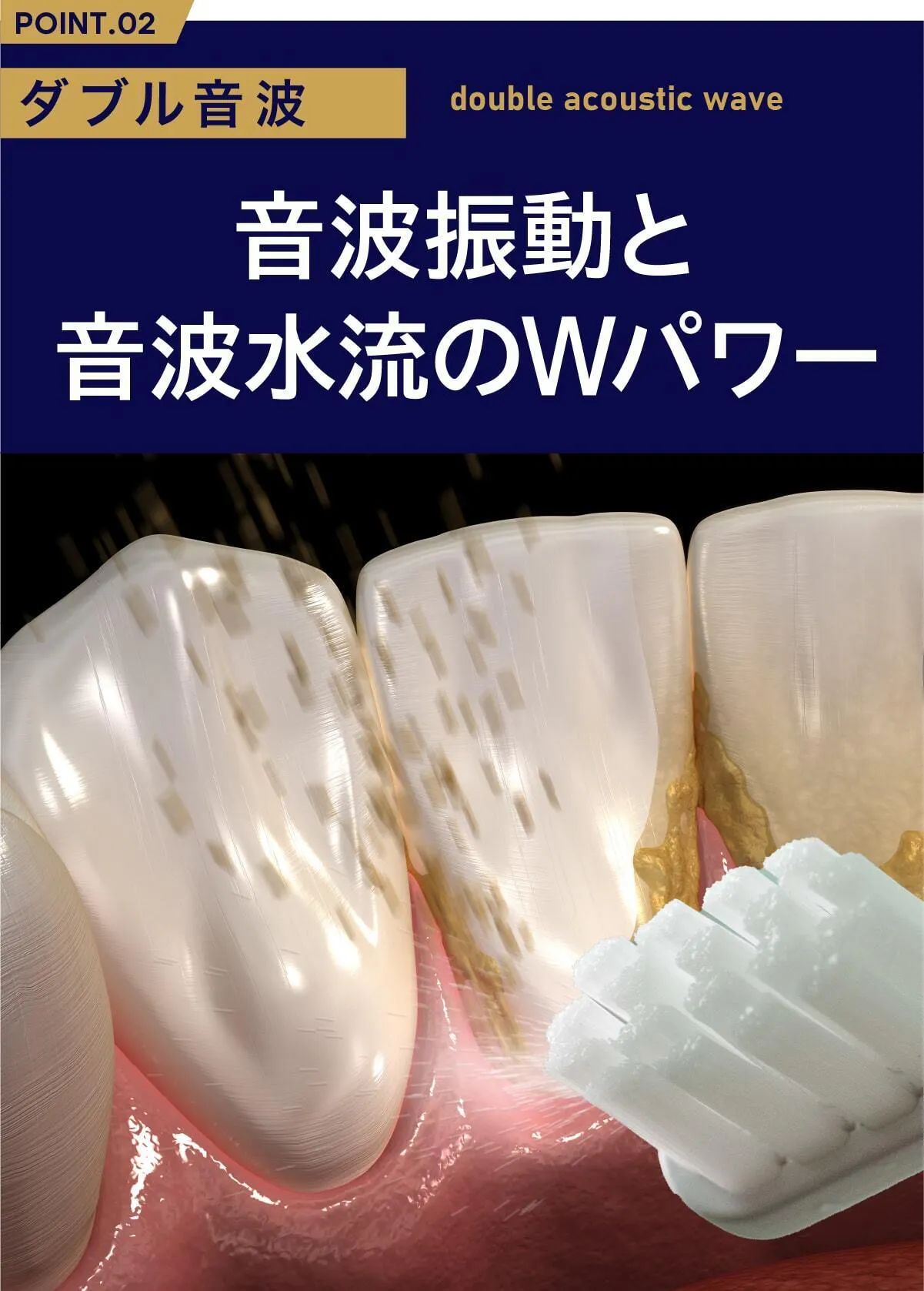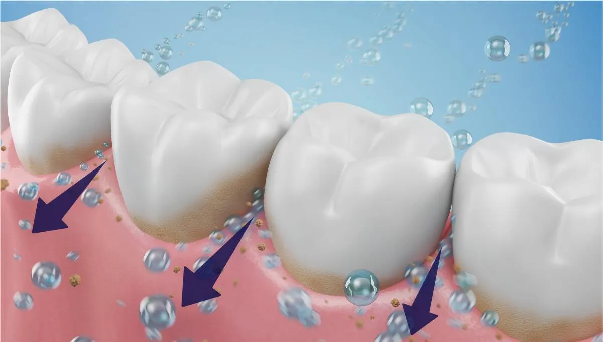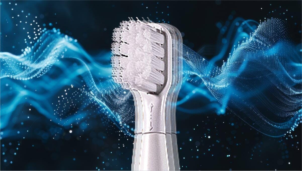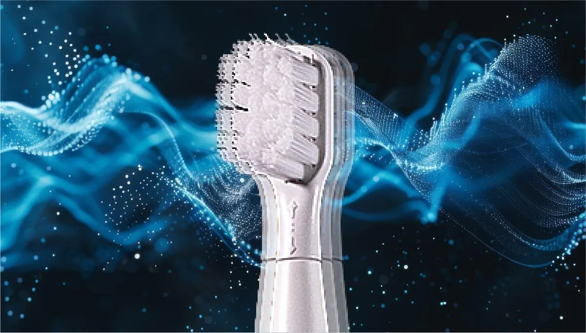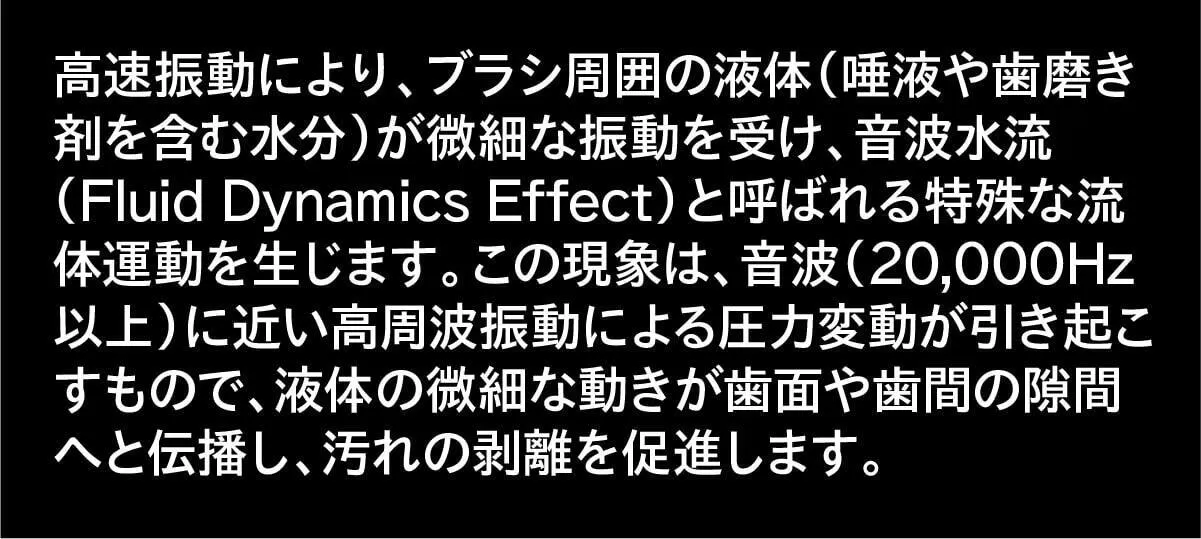 ミニマルソニックの振動は、音波(20,000Hz以上)に近い周波数を持ち、音波水流(Fluid Dynamics Effect)を発生させます。この水流によって、ブラシの毛先が直接触れていない場所(歯間・歯周ポケット)の汚れを浮かせて除去する効果が期待できます。