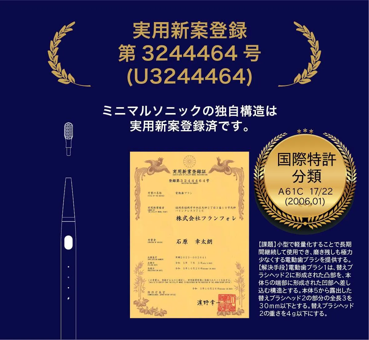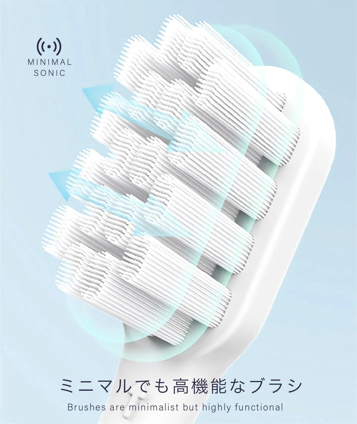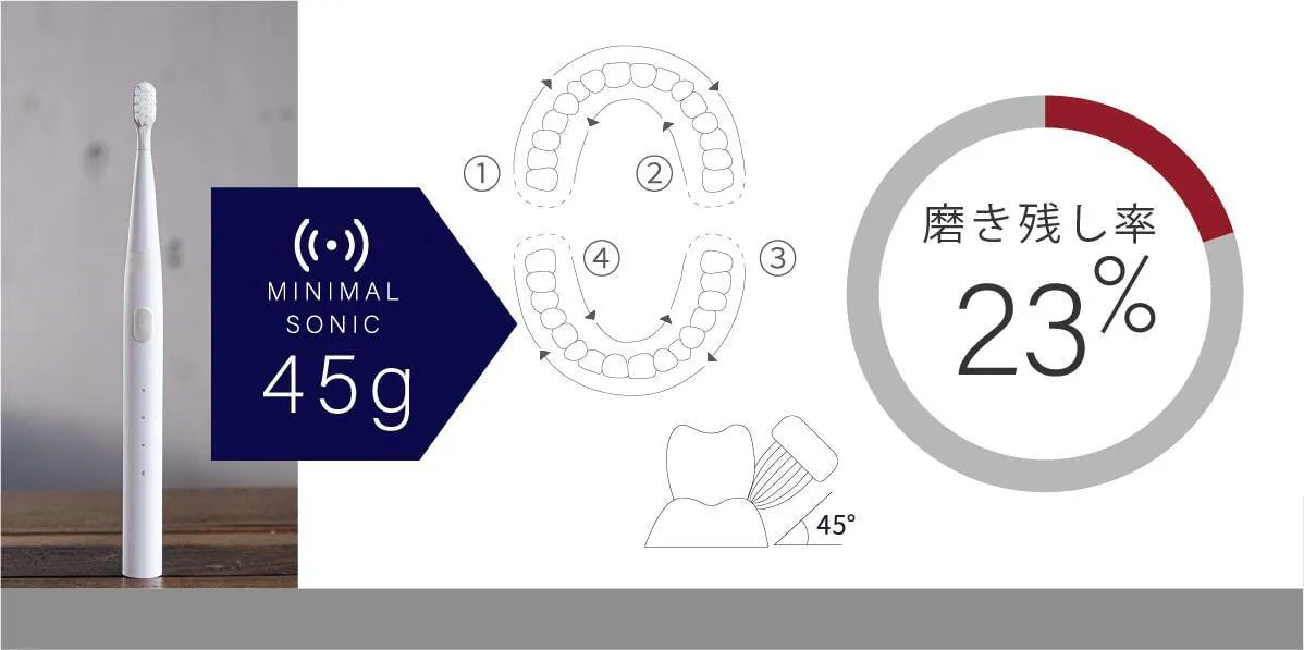 ミニマルソニックは、これまでの電動歯ブラシとは一線を画す「特許級」の新しい歯磨き体験 を提供します。実用新案登録済 の独自技術により、超音波振動が歯垢を効果的に除去しながらも、歯ぐきにやさしい洗浄を実現。手磨きや従来の電動歯ブラシでは落としきれなかった汚れを、よりスムーズに、より快適にオフ。ぜひ、この特許級のブラッシング体験 を、あなたの歯と歯ぐきで実感してください。