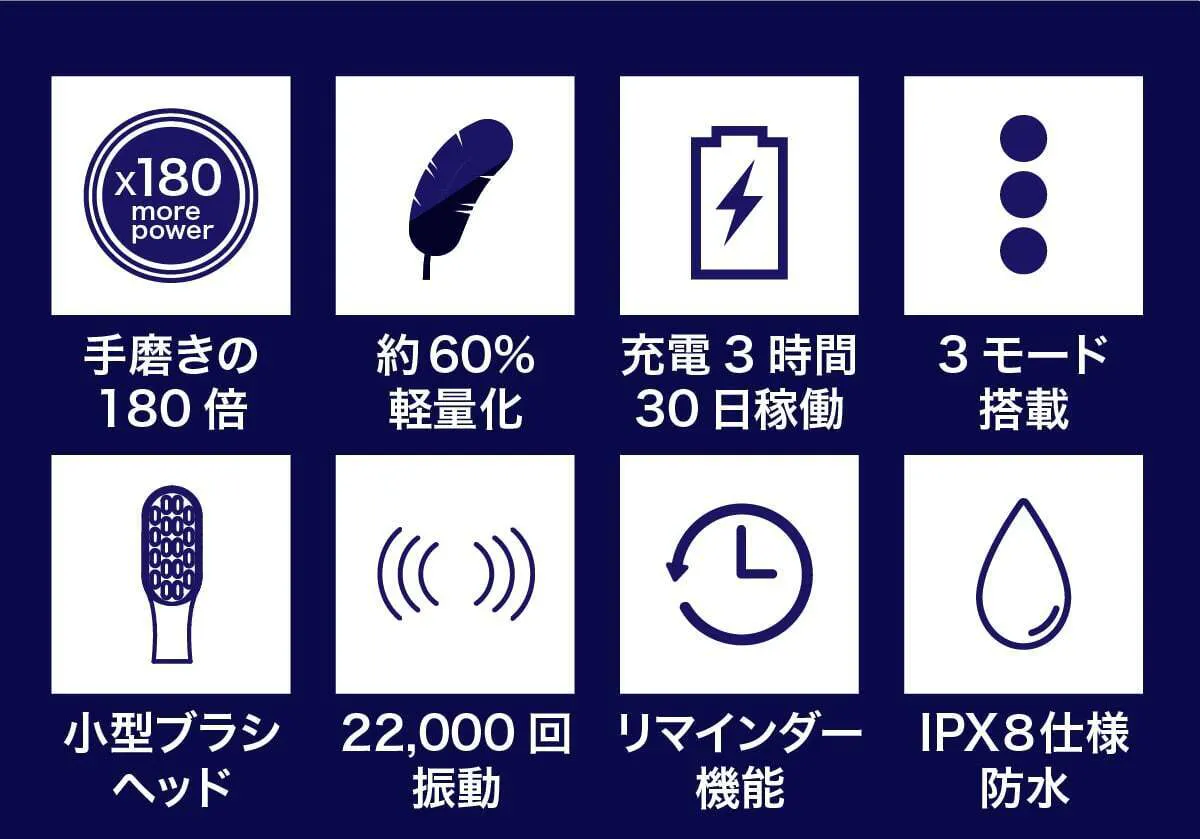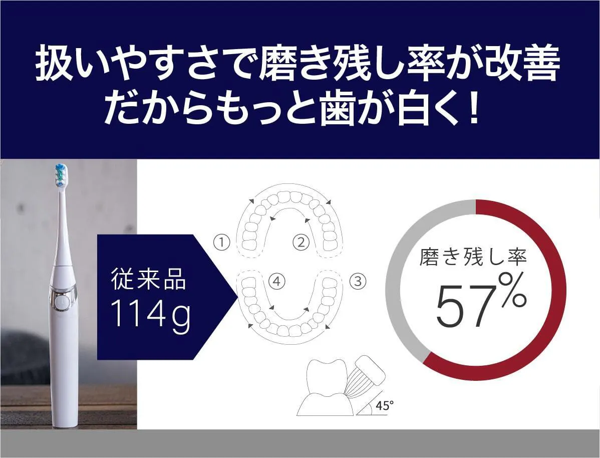 従来比約60%軽量化に成功、かつウルトラソニックパワー搭載、そしてリマインダー機能も。新しいガジェットを探している方にも、電動歯ブラシ未体験の方にも、2台目を探している方にも最適です。