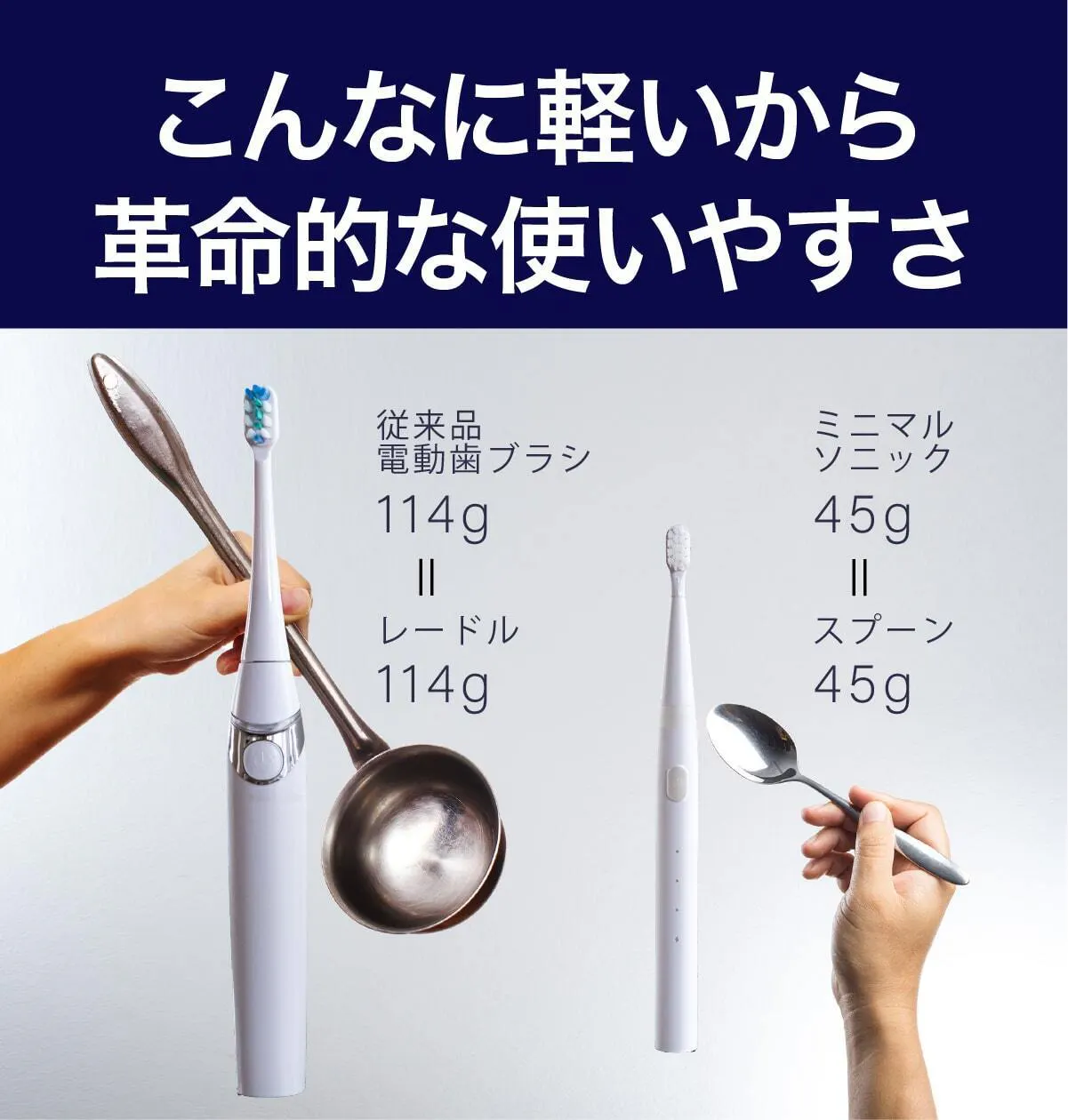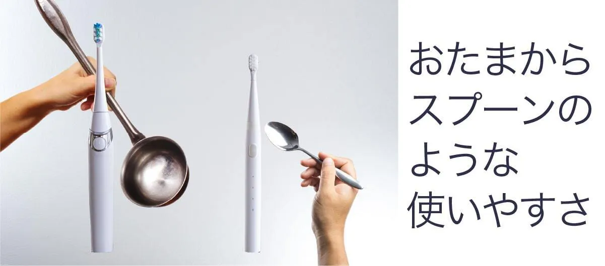 レードル(おたま)の重量は114g、これは従来の電動歯ブラシと同じです。スプーンの重量は45g、これがミニマルソニックと同じです。こんなに軽いから革命的な使いやすさを実現しました。