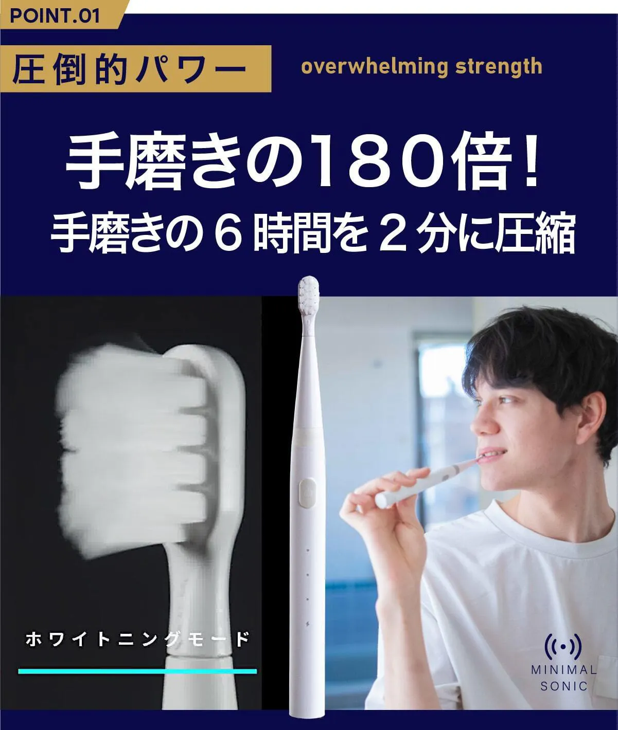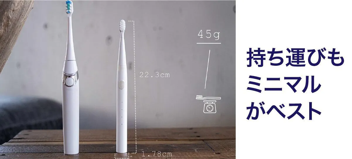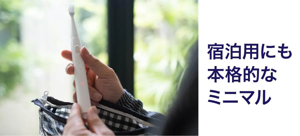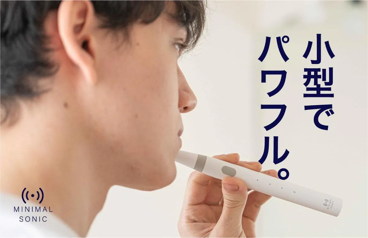 今までの電動歯ブラシを大きいと感じたことはありませんか?普通の歯ブラシから電動歯ブラシに変えた時にそれを大きく感じると思います。電動歯ブラシは構造上、大型化してしまうのですが、常識に囚われずまったく新しい電動歯ブラシを設計したのがこのミニマルソニックです。新発想の構造で小型でパワフル。未来の体験をはじめましょう。