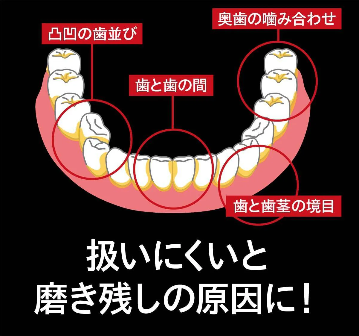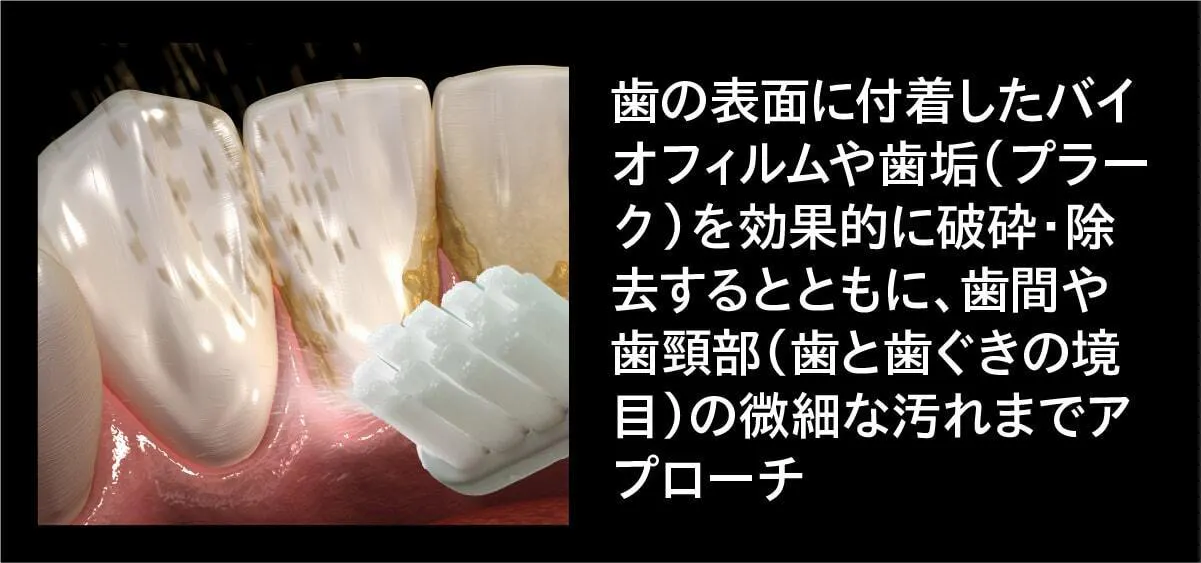 1分間に22,000回の振動が発生することで、高速なストローク運動(前後振動)が起こり、歯の表面や歯間に付着した歯垢を効果的に除去します。手磨き(約300~600回/分)と比較すると、圧倒的に細かく、強力な磨き効果を得られます。