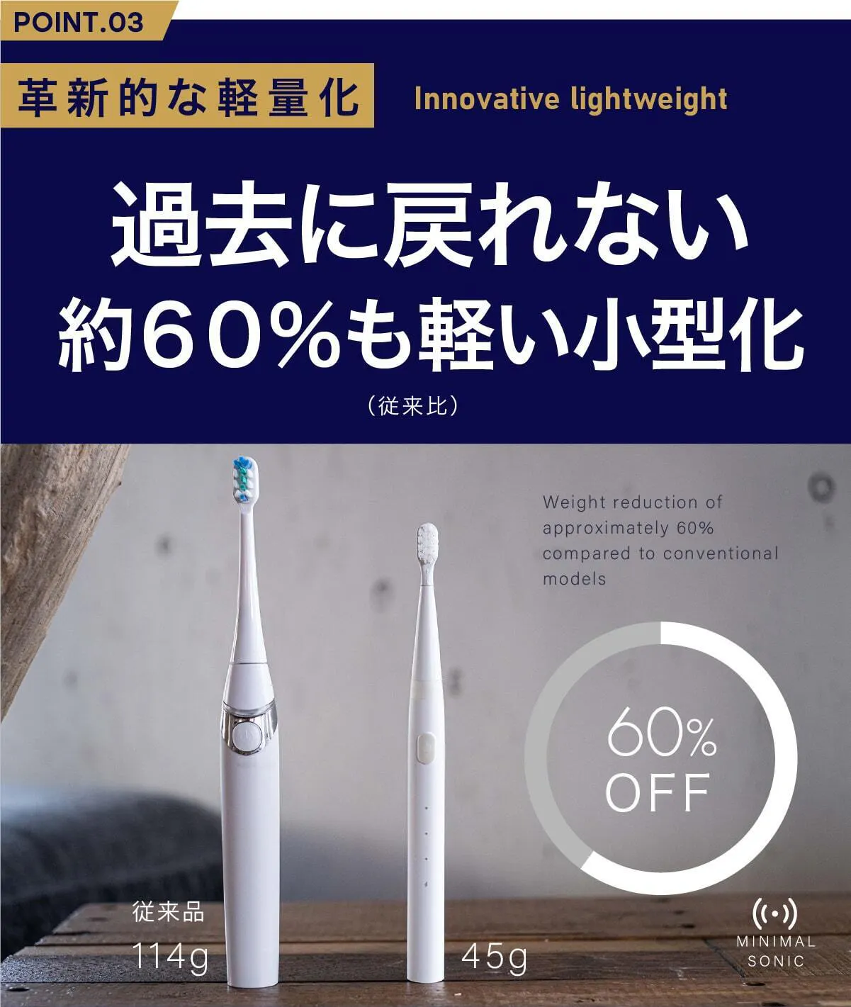 ミニマルソニックはパワフルなだけでなく、そのパワーを小さなボディに収めることに成功しました。高度な技術革新で約60%も軽くすることができたのです。