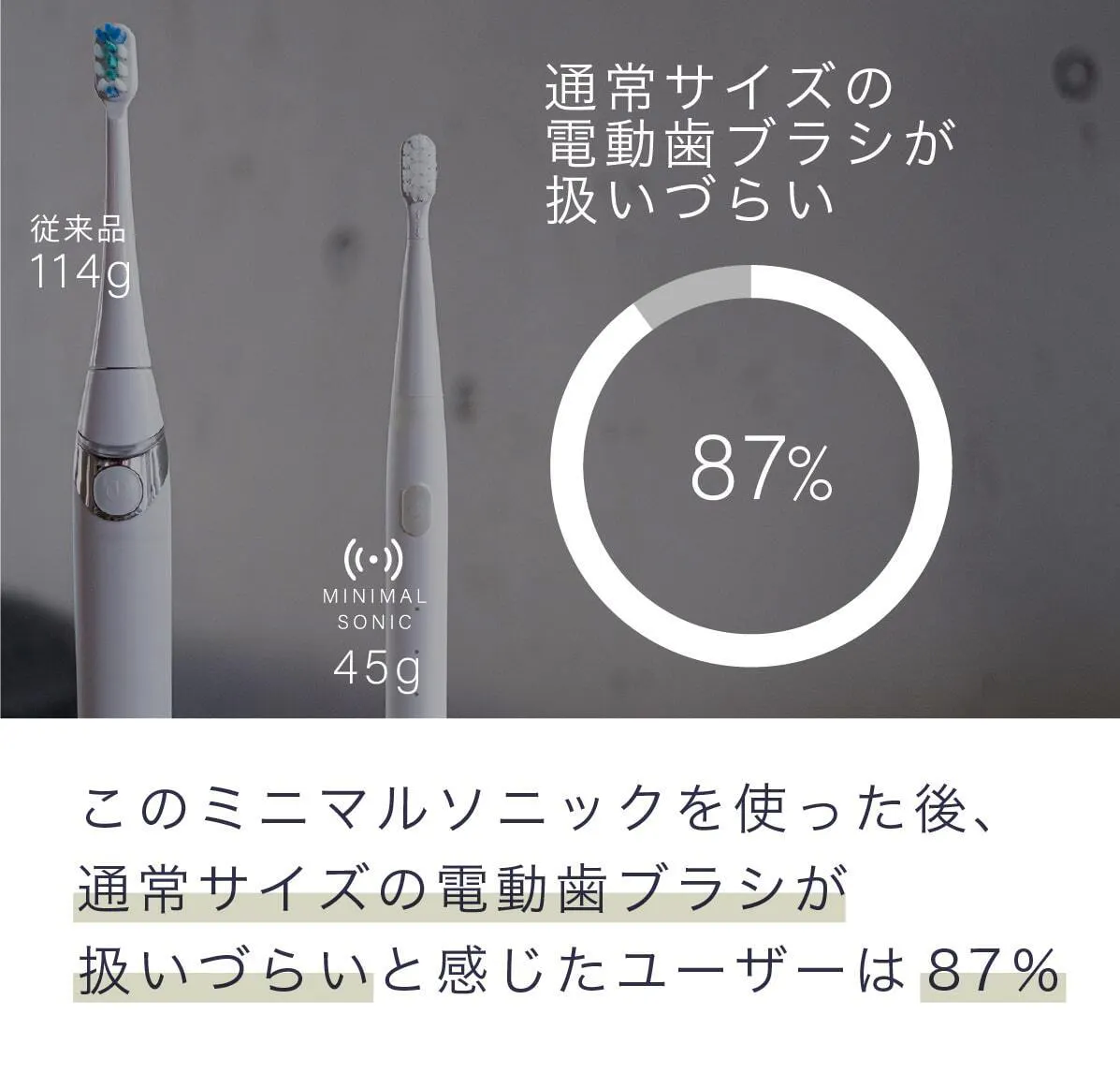 私達は日本の電動歯ブラシ普及率22%をなんとかしたいと考え、ミニマルソニックを誕生させました。口腔内のケアは大変重要なものであるにも関わらず、そのツールの進歩はまだまだです。ミニマルソニックが少しでも日本の電動歯ブラシ普及のきっかけになれば大変嬉しいです。