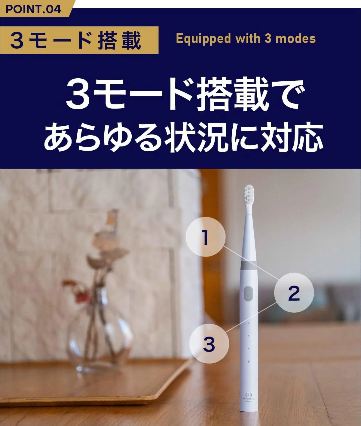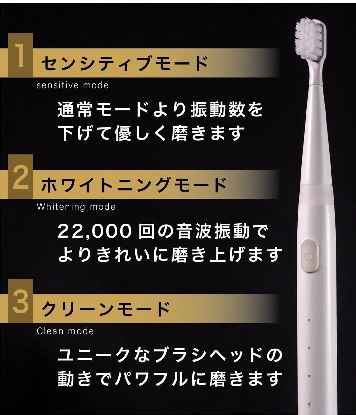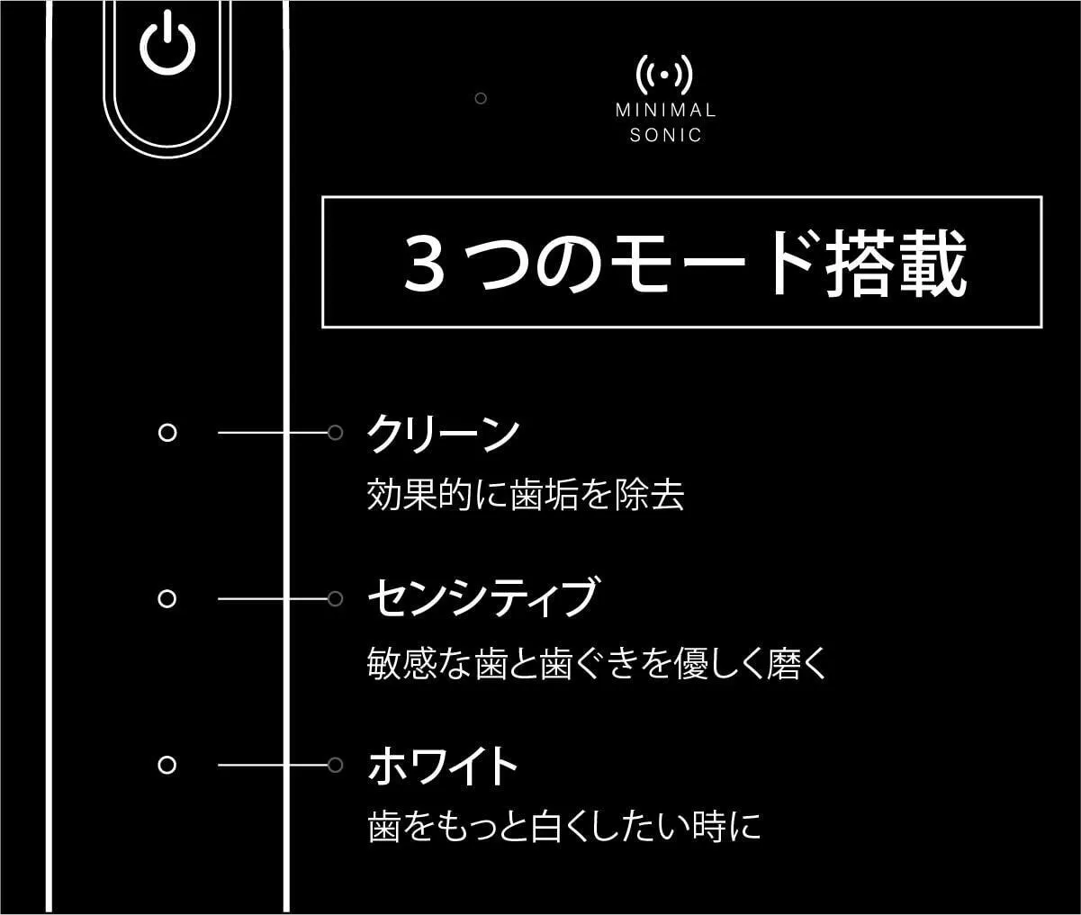 ミニマルソニックは3つのモードを搭載しています。あなたと口腔内の状態に応じて最適なものを選択することができます。
