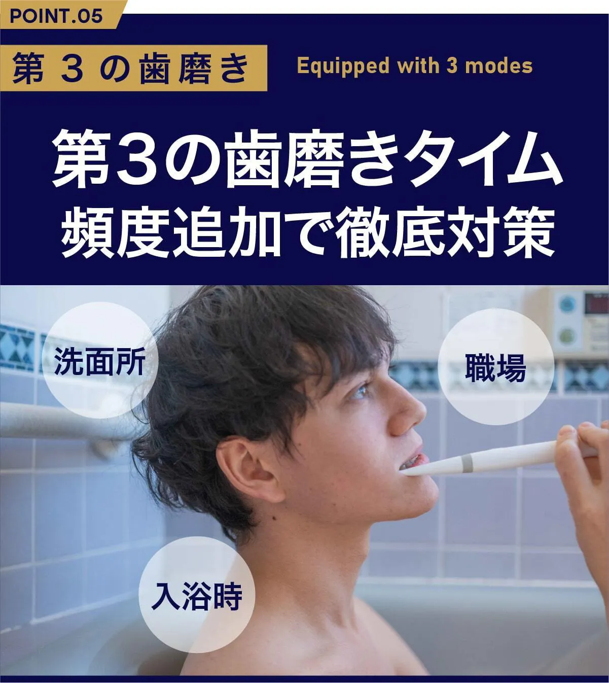 歯磨きは磨く回数が多ければより効果的です。私達は歯磨きのサードプレイスをご提案します!浴槽にゆっくり浸かりながら、ミニマルソニックタイムをプラスして下さい。入浴中の歯磨きは様々な歯科医も推奨しています。