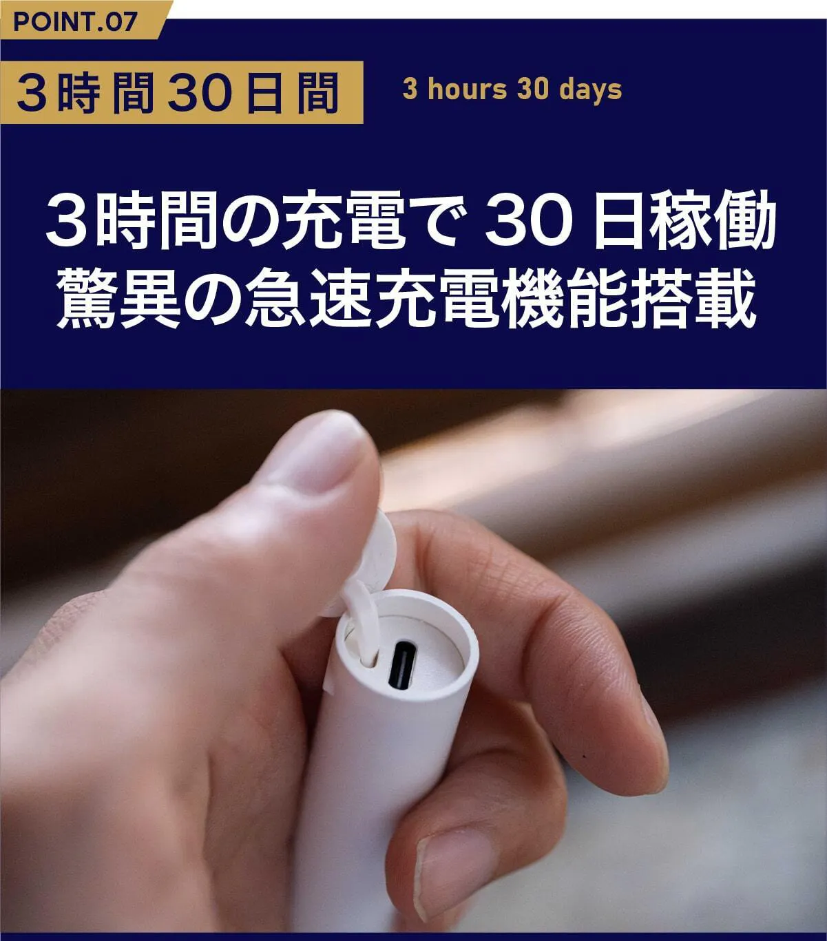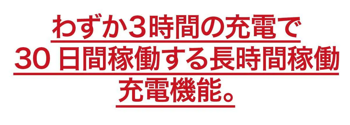 ミニマルソニックは長時間稼働を実現したタイプC急速充電を搭載。わずか3時間の充電だけで、なんと30日間も稼働します。