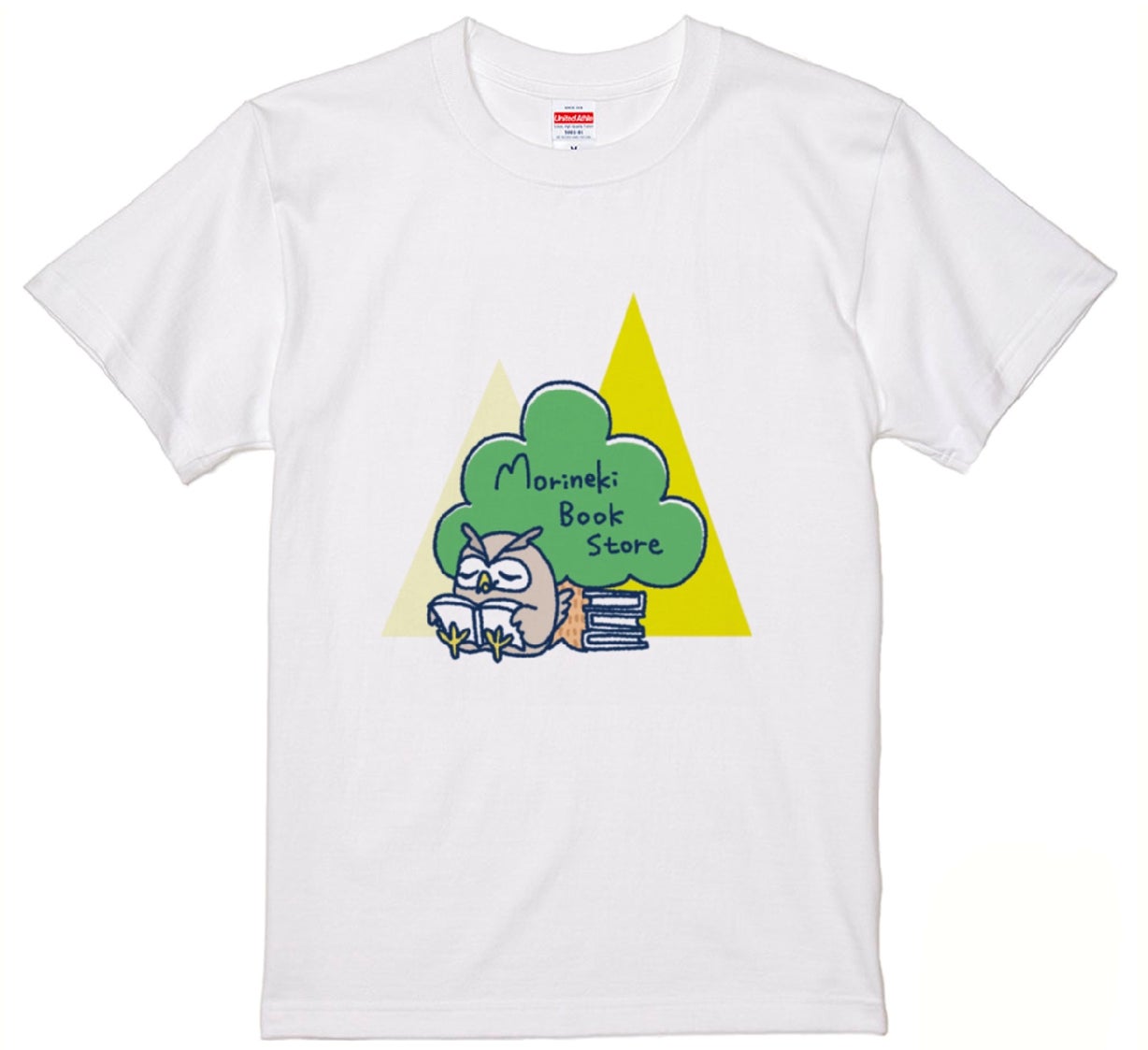 ミミズクが本を読んでいるイラスト可愛いです。袖口にももりねき書店のロゴが入ります。参考にしていただければと思います。ミミズクは「森の番人」「森の賢者」とも呼ばれていて、たくさんの方が相談にお越しになるもりねき書店をイメージしていただきました。