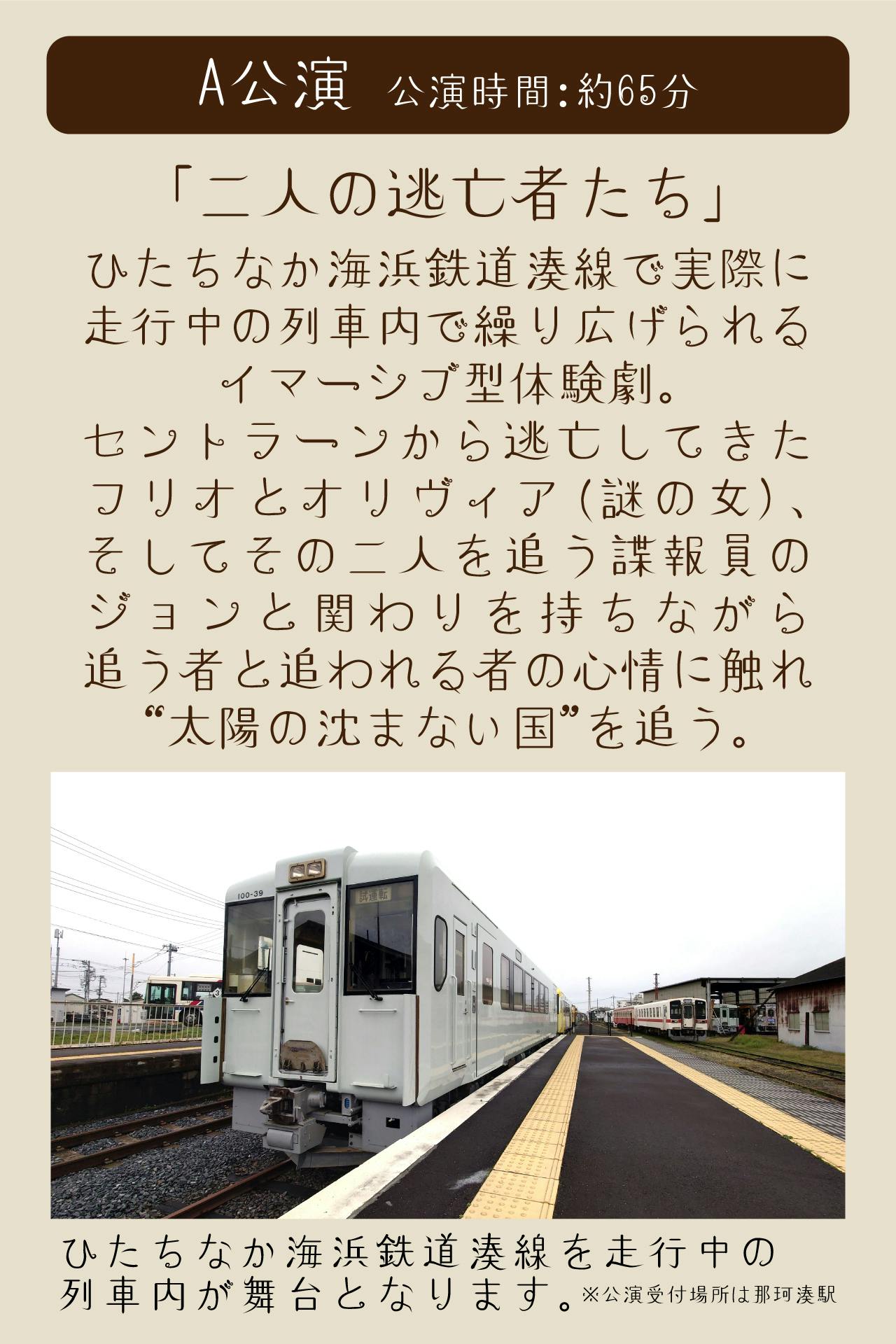 ※観劇には公演チケットの他にひたちなか海浜鉄道の1日フリー切符(大人600円、小人300円)が別途必要となります。予め購入、もしくは受付後に那珂湊駅窓口にてご購入ください。勝田駅からJR線乗り継ぎで那珂湊駅に向かう方は勝田駅で1日フリー切符のご購入をおすすめいたします。
