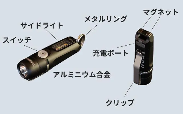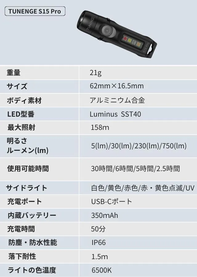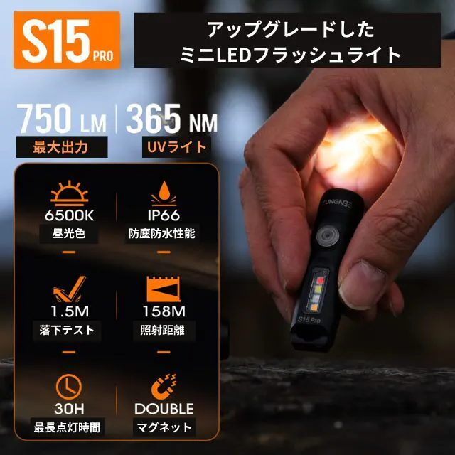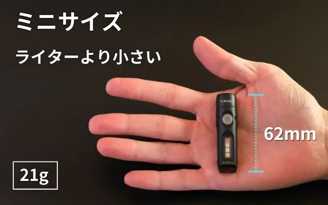 「S15 Pro」は、キーホルダー感覚で、鍵やバッグ等につけて常に持ち歩けるようなサイズ感がとても魅力です。「約6cmで21g」と、とっても小さいのに、メインライトは最大750(ルーメン)の明るさまで出力可能な高光度ユニットを搭載。