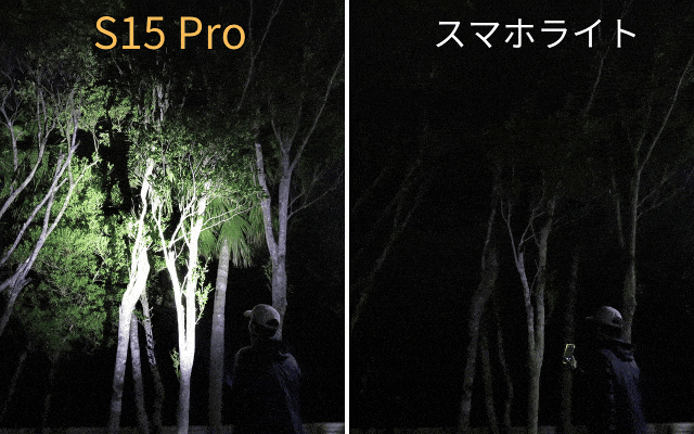 スマートフォンのライトは30~70ルーメン程度と低照度な上、電池消耗も早いもの。「S15 Pro」はスマホの約10~12倍の明るさで、158メートル先まで瞬時に照射可能。スマホのバッテリー節約にも役立ちます。