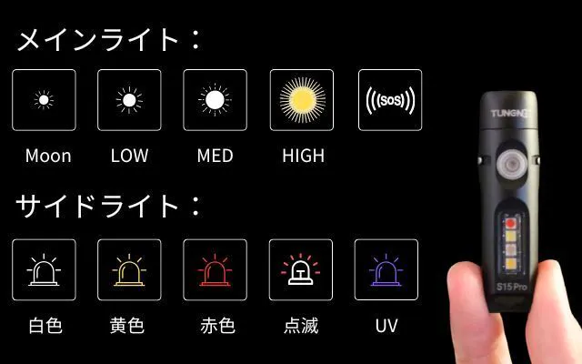 「S15 PRO」は、【メインライト】,【サイドライト】,【クイック点灯】の3つの基本モードを搭載しています。