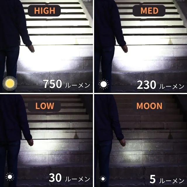 メインライトは、MOONライト(5ルーメン)、LOWライト(30ルーメン)、MEDライト(230ルーメン)、HIGHライト(750ルーメン)、STROBE(750ルーメン)、SOS(100ルーメン)の6種類から選べます。