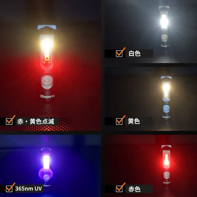 このモードでは、「白色」、「黄色」、「赤色」「点滅」,「UV」の5つの機能を選択。夜間の作業、夜釣り、BBQの灯り、キャンプなどに良く視界を提供したり、非常時の信号として役立ちます。