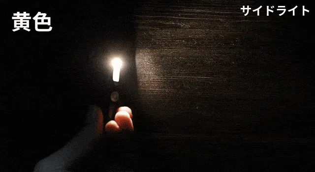 サイドライトについては、白色は約4.5時間、黄色は約4時間、赤色は約2.5時間、点滅は8.5時間、紫色(UV)は2時間です。