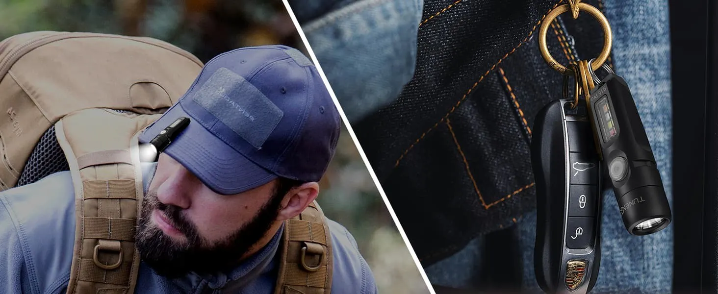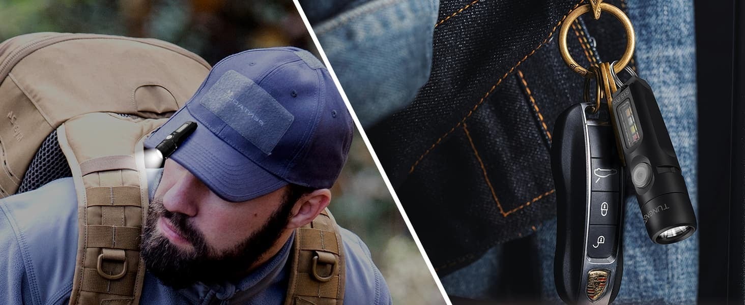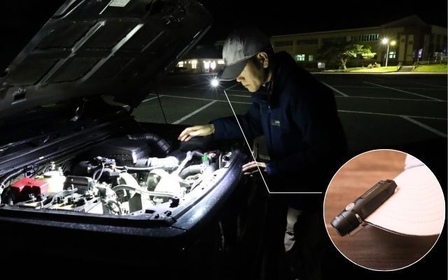 キャップに装着してヘッドライトとして。キーホルダーと一緒にいつも持ち歩ける。車の急な故障や愛犬のお散歩中の安全のために。