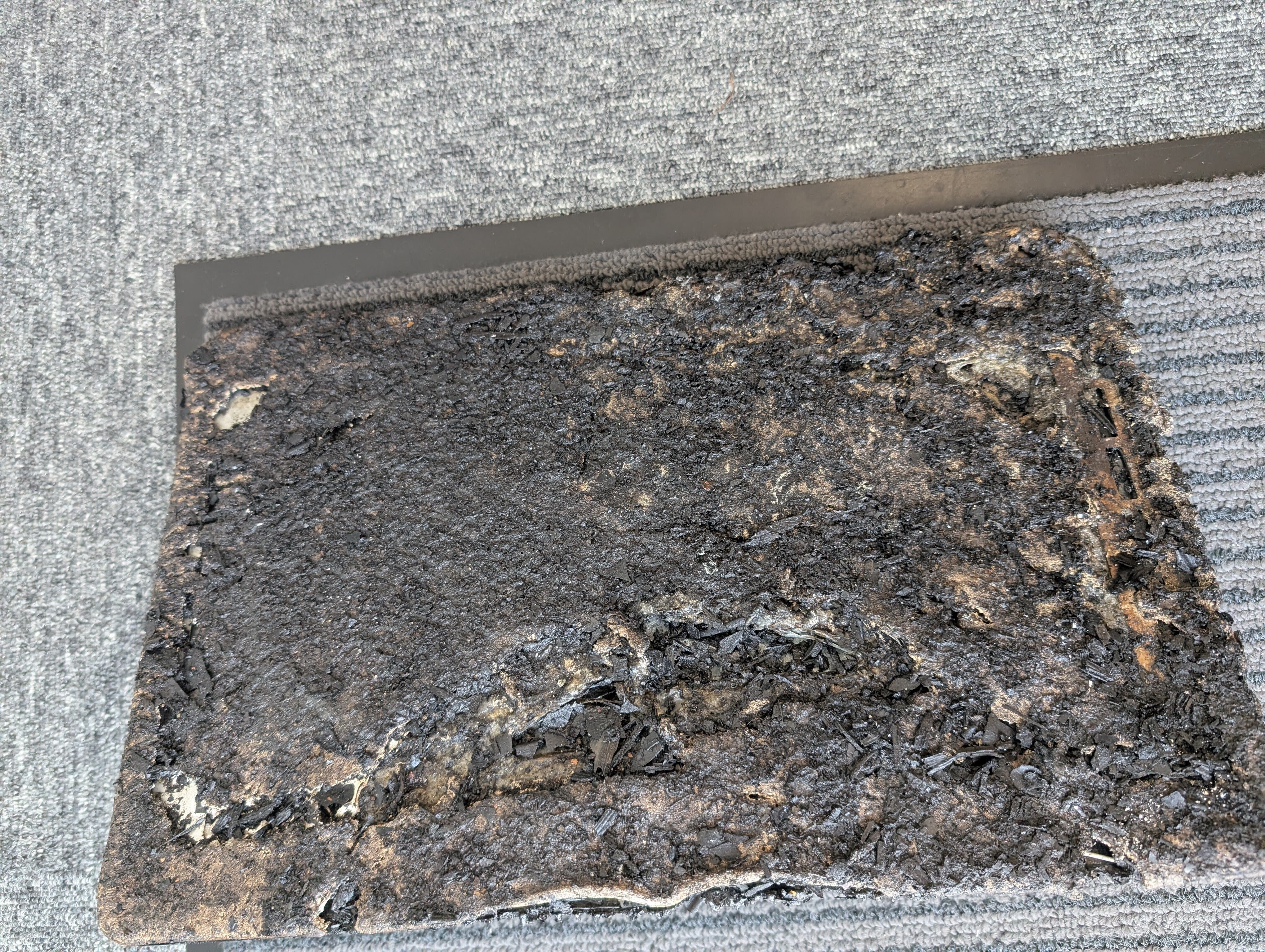 ↑ノートパソコン救出。真っ黒こげで表面溶けていたけど中のデーターは濡れただけで生きていました!