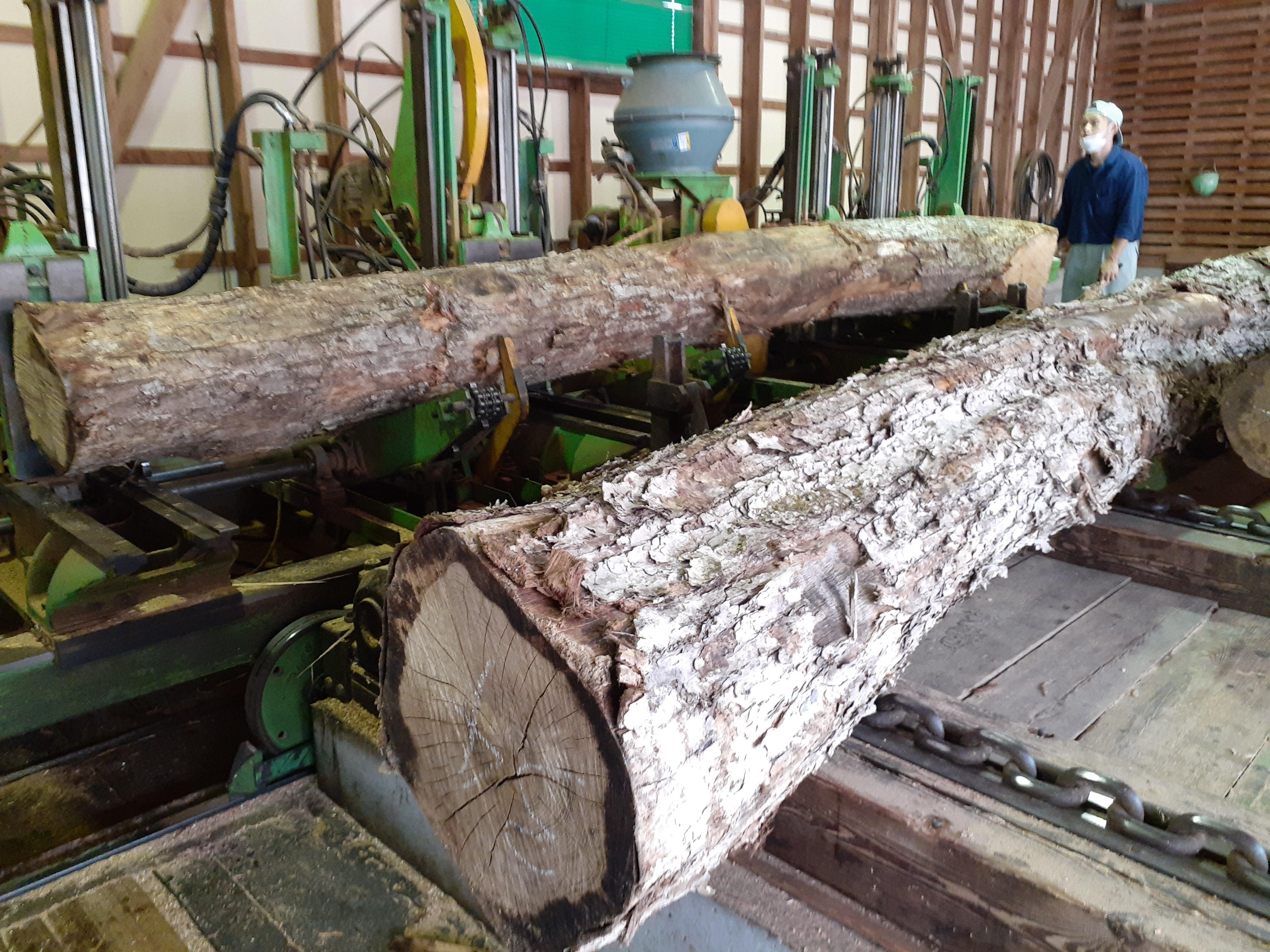 ↑虫が入らないように高圧洗浄機で表皮(皮)を剥いでから桟積み(さんづみ)して1~2年ほど天然乾燥させます。