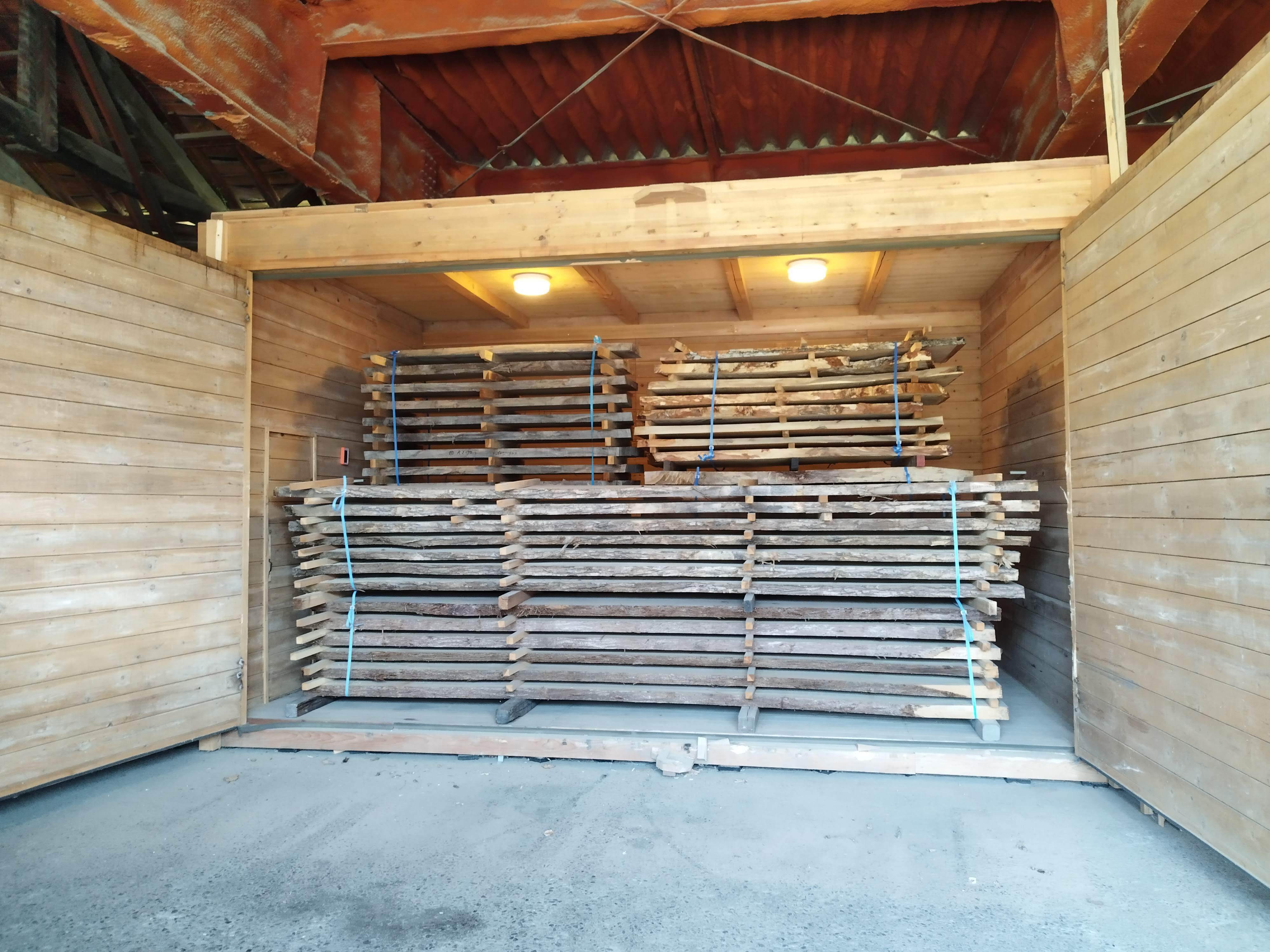 乾燥方法も多種あるのですが、テーブルサイズの大きな一枚板は、天然乾燥(約2年間)⇒低温乾燥機(約2か月)(⇒高周波乾燥機)を使用して乾燥させるのがベターであると思い施工しております。ただ、そのすべてを行うとコストもかかり販売価格も高価になるため、それぞれの板を見て判断しています。いづれにせよ一枚板のような大きな板は伐採から使用できるまで2年以上は必要になるといった材料です。ですので大量のストックが必要になります。
