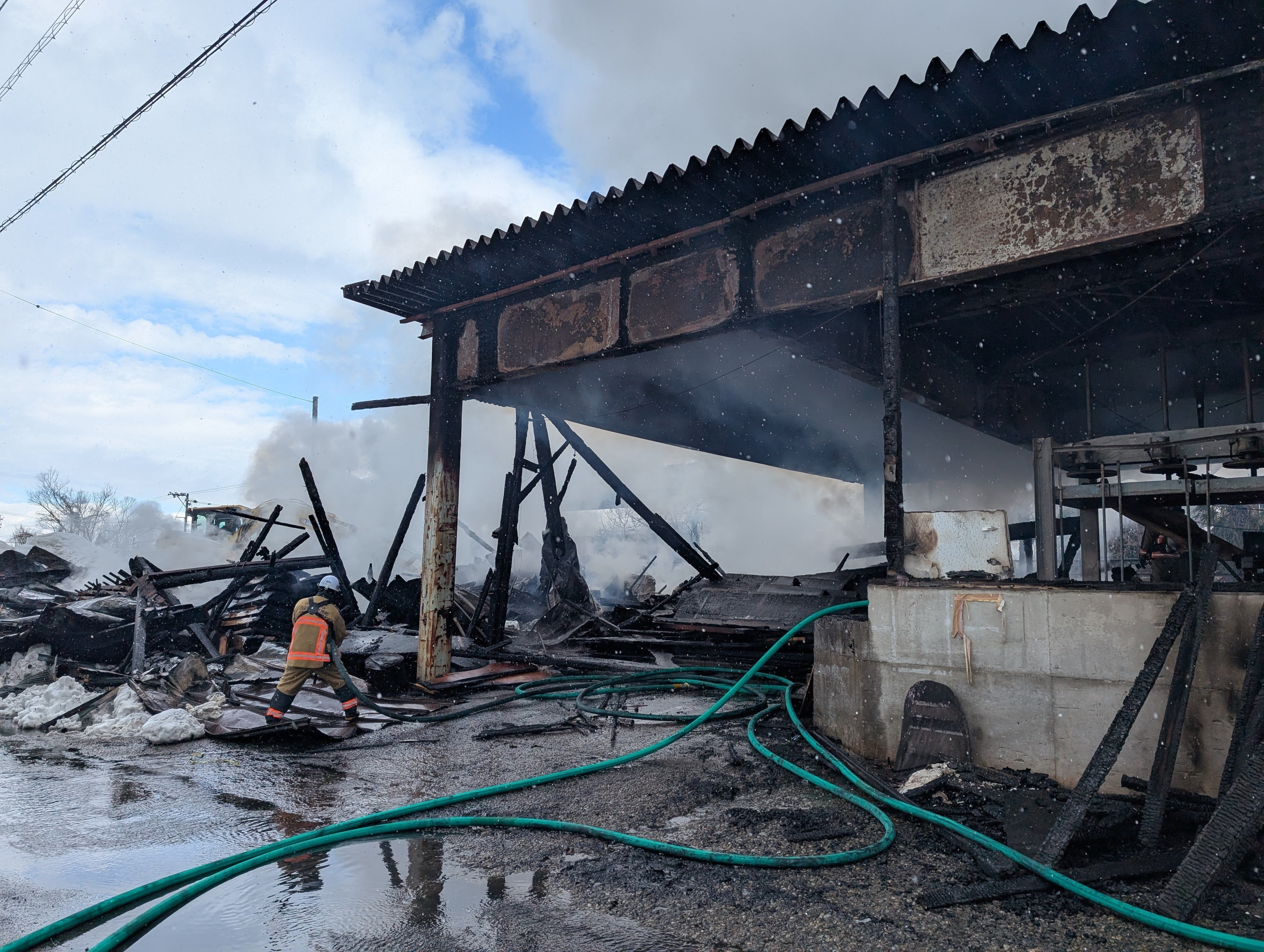 出火原因は不明としながら、木材倉庫建物の天井照明(蛍光灯)の配線にショートした疑いがあるとの見解でした。