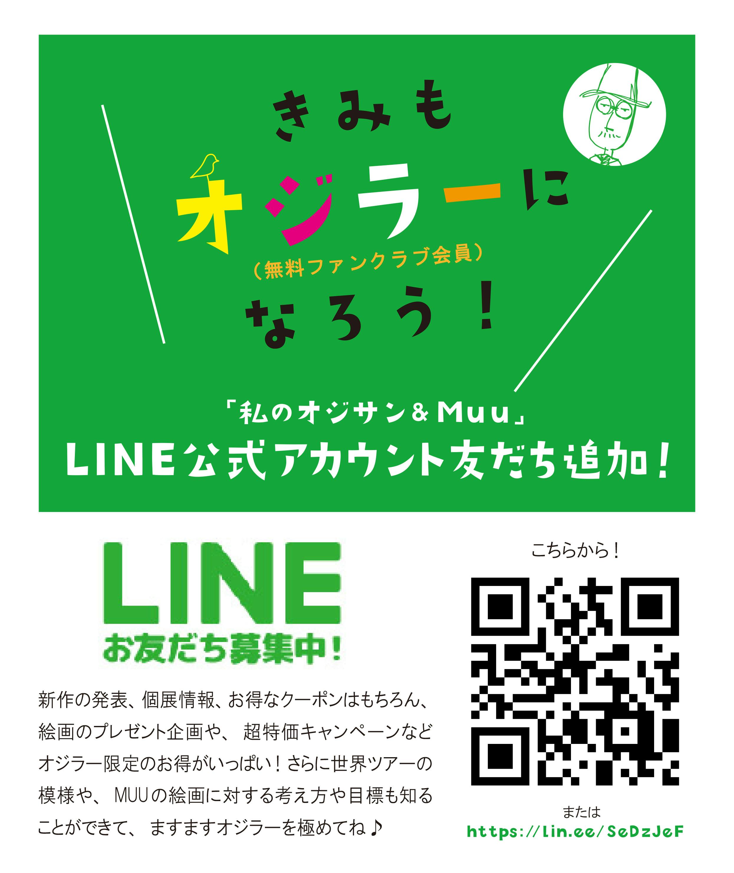 『私のオジサン公式LINE』は新作の発表や、個展情報、絵のプレゼント企画など、お得な情報満載ですので、是非オジラー(公式LINE友だち)になって、今後のオジサン画家MUUの歩みを応援して頂けたら幸いです。