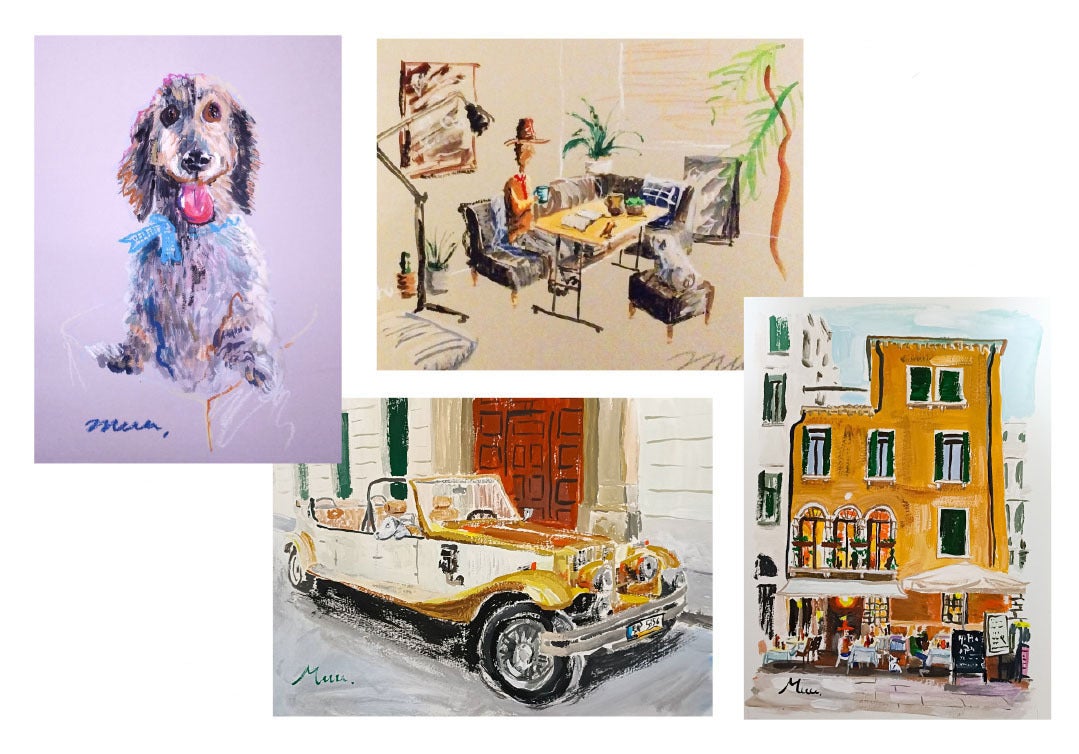 ご希望の絵を描きます!A4ほどの大きさで、ペット、新居、インテリア、愛車などから1つを選んで頂き、アクリル画で描きます。(原画裏に直筆サインを入れてお届けします)