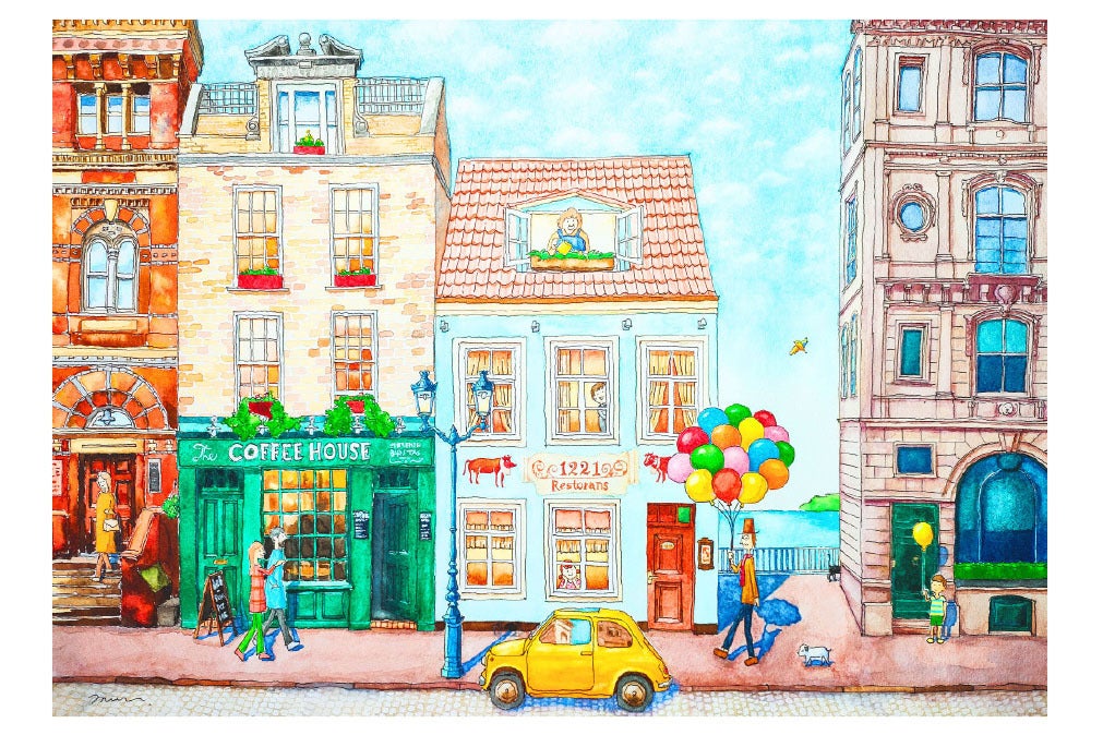 オリジナルアートプリント(A4)『カラフルタウン風船散歩』1点