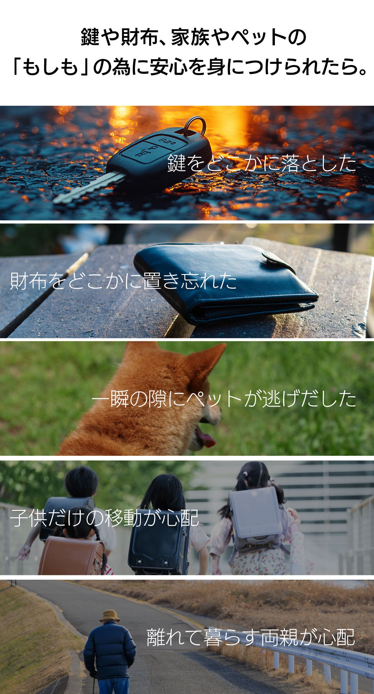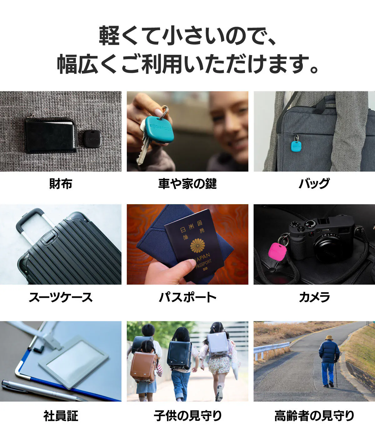 普段持ち歩く貴重品の管理、盗難防止、忘れ物防止や見守りなど、あらゆるシーンであなたの生活をサポートします。