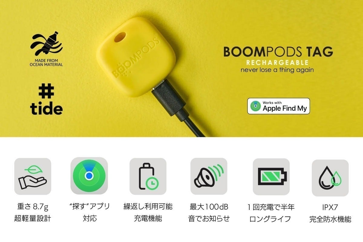 海洋プラスチック #tideを100%使用して作られた、地球に優しい充電式紛失防止タグです。使い捨てのタグや、交換するたびにゴミとなる電池に抵抗がある方にも安心してお使いいただけます。
