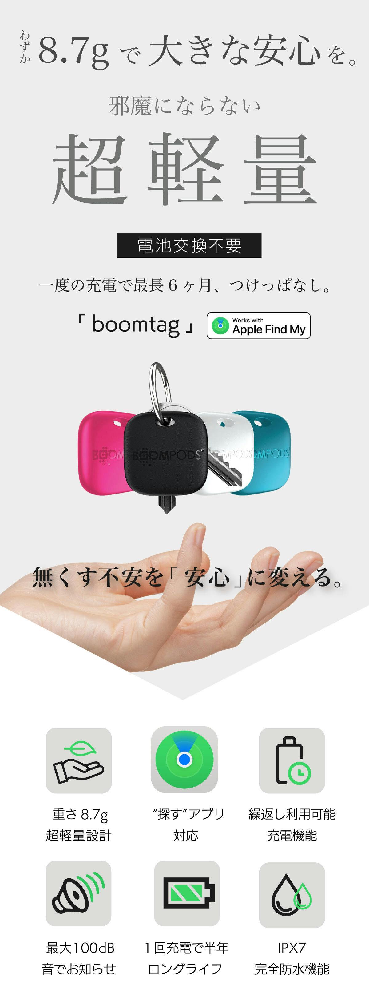 このboomtagは、一度の充電で最大約6ヶ月間使用可能です。頻繁な充電の手間がなく、長期間にわたり安心して利用できます。