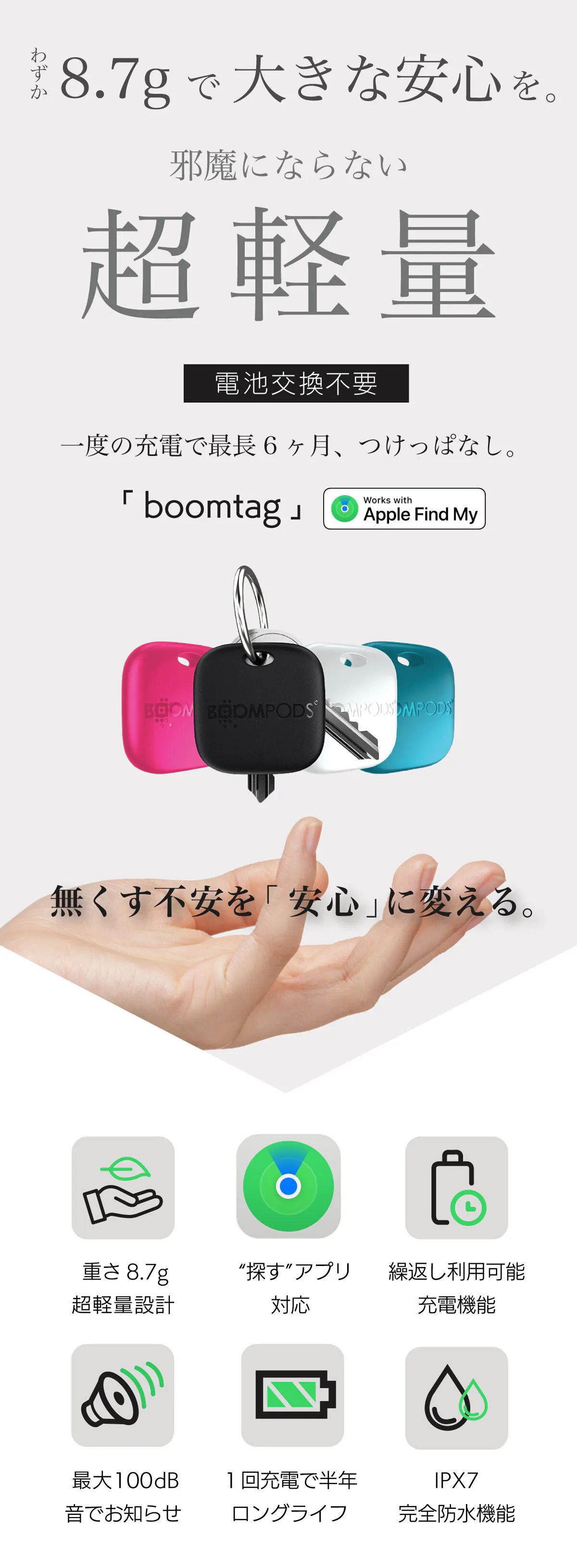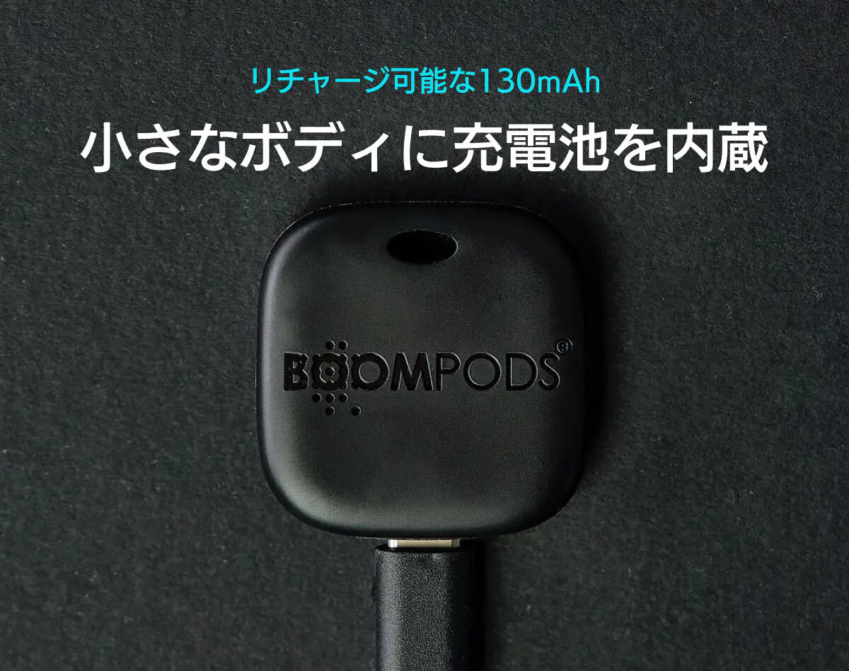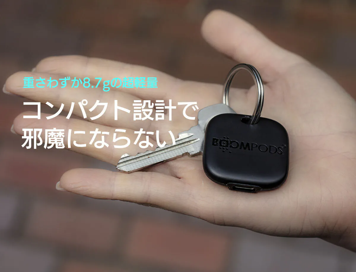 一般的な紛失防止タグはボタン電池が採用されていたり、一部には電池交換ができないものも存在しますが、このboomtagは電池交換の必要は一切ありません。