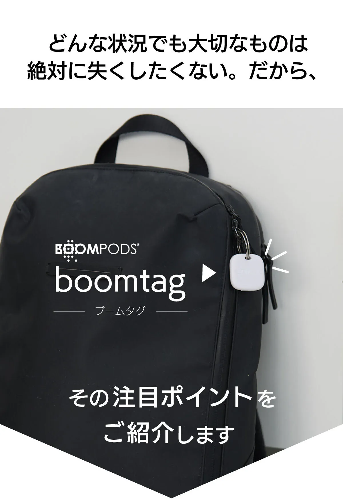 スマホとboomtagが一定の距離(約300〜500m)が離れると通知がプッシュされ、すぐに気が付くことができます。