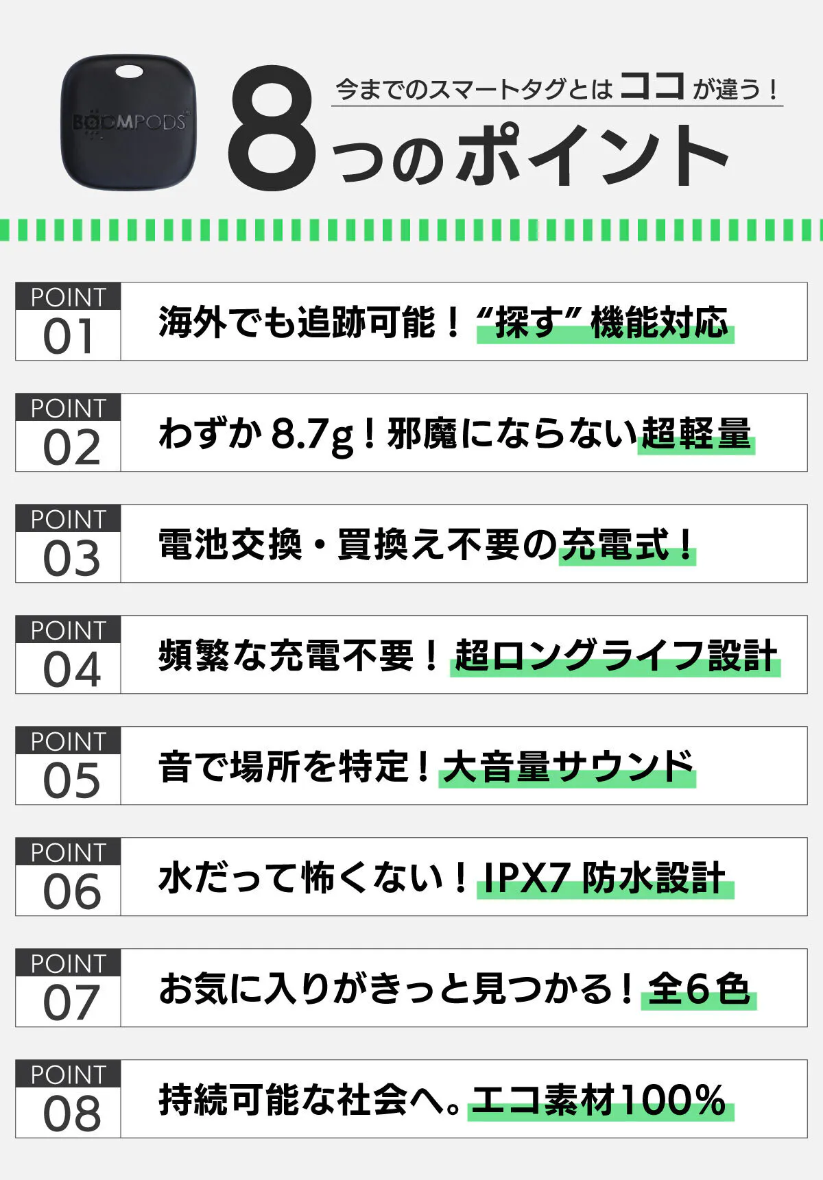2025/03/27 11:40【紛失防止タグ boomtag】machi-yaプロジェクトスタートいたしました!カードタイプのスマートタグで充電式は当たり前ですが、タグタイプでの充電式はほとんどありません!小さなボタン電池の交換や、電池ゴミの処理も面倒ですよね。。。boomtagならその面倒がありません!!そしてプラスチック部分は、海洋プラスチック100%のリサイクル素材でできています。プラスチックゴミが世界中で問題になっていますが、メーカーのBOOMPODS社はその問題に取り組み、海洋プラスチックの削減に貢献している素晴らしい企業です。様々な企業がスマートタグを製造していますが、環境問題に取り組む企業はありません。BOOMPODS社のような素晴らしい企業が日本で当たり前になるように、私たちと一緒にこのプロジェクトを盛り上げていただければ幸いです。boomtagプロジェクト、引き続きよろしくお願いいたします。株式会社シンコー AtmosNook 運営チーム一同 もっと見る