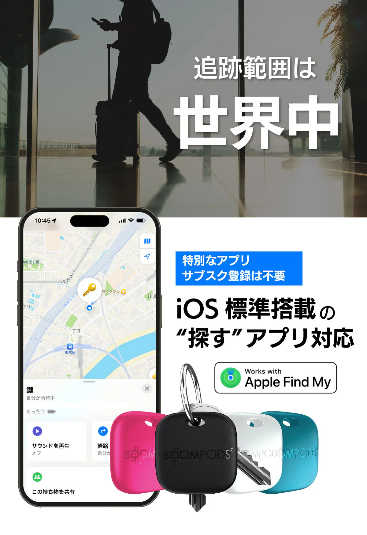 boomtagは、iOS標準搭載アプリの「探す」に対応しています。その追跡範囲は全世界となり、国内だけでなく海外でも使用することが可能です。