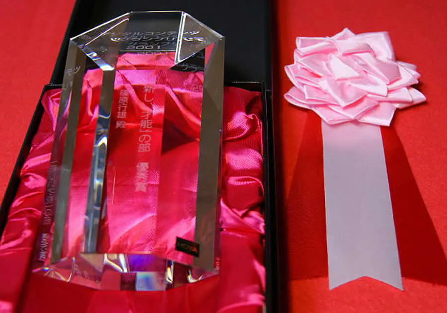 この「ビジュアルお天気メモリ」は、2001年に、デジタルコンテンツ協会主催、経済産業省共催の「デジタルコンテンツグランプリ2001」(DCAj)に出品し、応募総数136組、「新しい才能の部」の出品総数40組の中において、各界の専門家による審査委員会を経て、「優秀賞」(5組)をいただくこととなりました。贈賞式が、東京青山テピア(鉄鋼会館)において行われ、他の部も合わせ、NTTコミュニケーションズ技術チーム・ソニー銀行技術チーム・NHKのCG制作チーム・スタジオジブリのプロデューサー鈴木敏夫氏の他、蒼々たる出展企業の受賞者がNHKのアナウンサーの司会進行で受賞する、その同じ壇上にての受賞となり、「晴天の霹靂」の受賞でした。子供会の行事やアウトドアで「統計的に晴れがちな日が知りたい」という単純な動機のソフトウェアが、公的な第三者機関により評価され、このように大きな賞をいただくとは夢にも思っていませんでした。この受賞の経緯詳細は、次のサイトで公開しています。