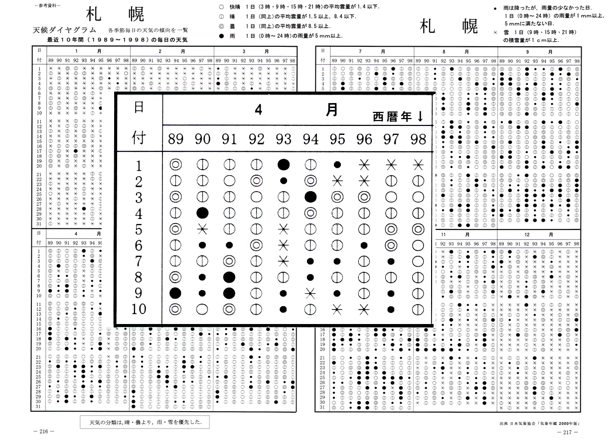 「天候ダイヤグラム」は、「人類の英知」と言えるほどの素晴らしいものですが、しかし、いくつか工夫すべき重要な課題がありました。1つは、「ザーザー降り」のような雨と、傘の必要性を感じないようなわずかな雨とを、日常の生活感覚との違和感を感じないように、明確に区別して表示する必要があったこと。 2つめは、どの日どの時期が好天傾向かが簡単に素早くわかるような便利な手立てが必要でした。 3つめは、過去天気の記録には、快晴や薄曇り・雷・あられ・みぞれ・ひょう・キリ・キリ雨・ふぶき、等のすべてが記録されていて、「地域気象史」的にも使える素晴らしいものなのですが、それらの多くが省略され、切り捨てられていました。もったいない?というか、これらの記録をすべて表示することが大きな課題でした。