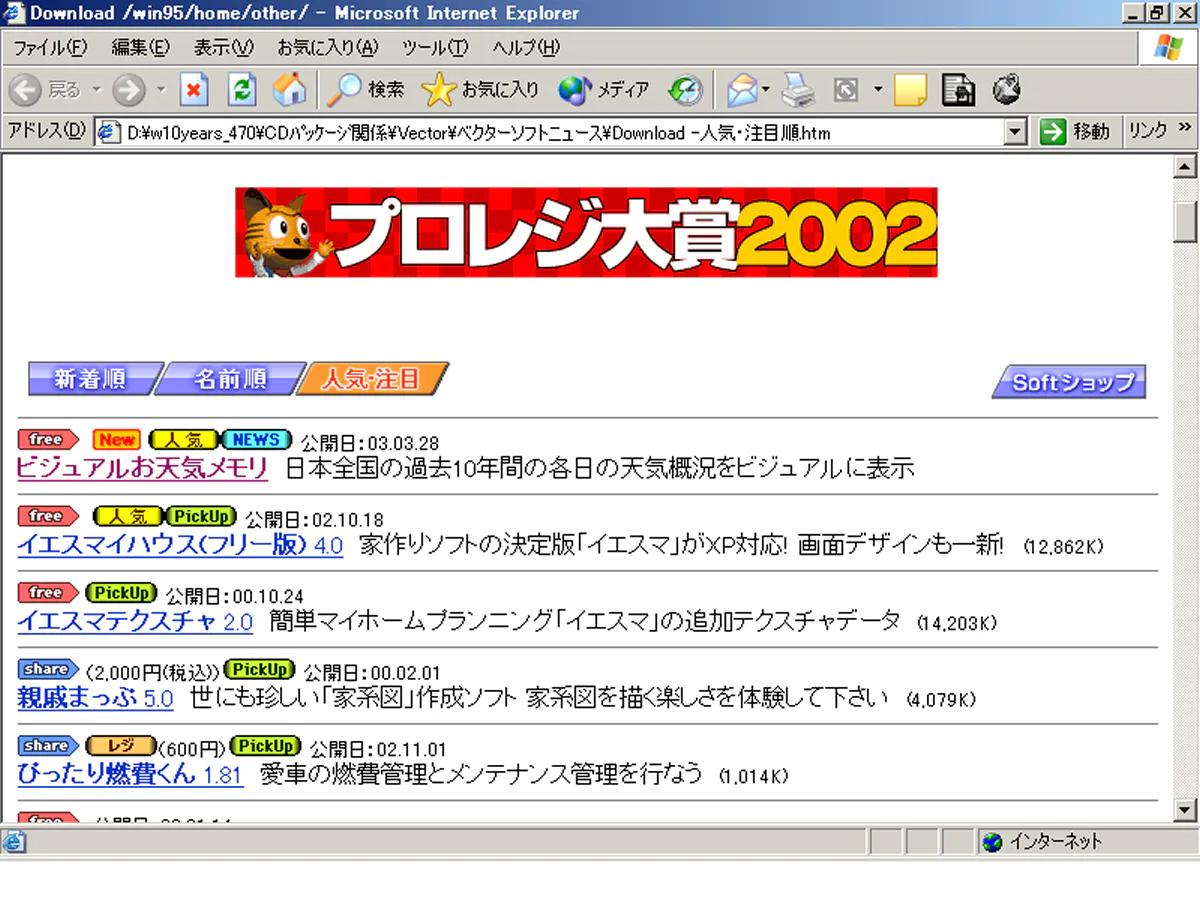 上記「ビジュアルお天気メモリ」は、一般公開後、Vector社でのダウンロードは続き、公開3ヶ月後には「定番ソフト」となり、その定番ランキングでも上位の座を何度もという、絶大な人気と評価を全国の皆様からいただきました。また、インプレス社 窓の杜でも2度のレビュー紹介をいただき、気象庁の部内広報でもご紹介をいただきましたし、全国のユーザーの方からも感謝や激励のメールを多数いただきました。各種の雑誌にも多数掲載されました。また、2009年には マイクロソフト社よりBizSpark特別開発会員の特典の恩恵に預かりました。2011年には、ソフトウェアのミシュランガイドと言われるヨーロッパのソフトニック社より、星9個の高い格付けをいただき、そのソフトニック社が日本法人サイトを開設する際には、最終30万本のソフトが掲載される予定の中で最初の千本の1つに選定されています。