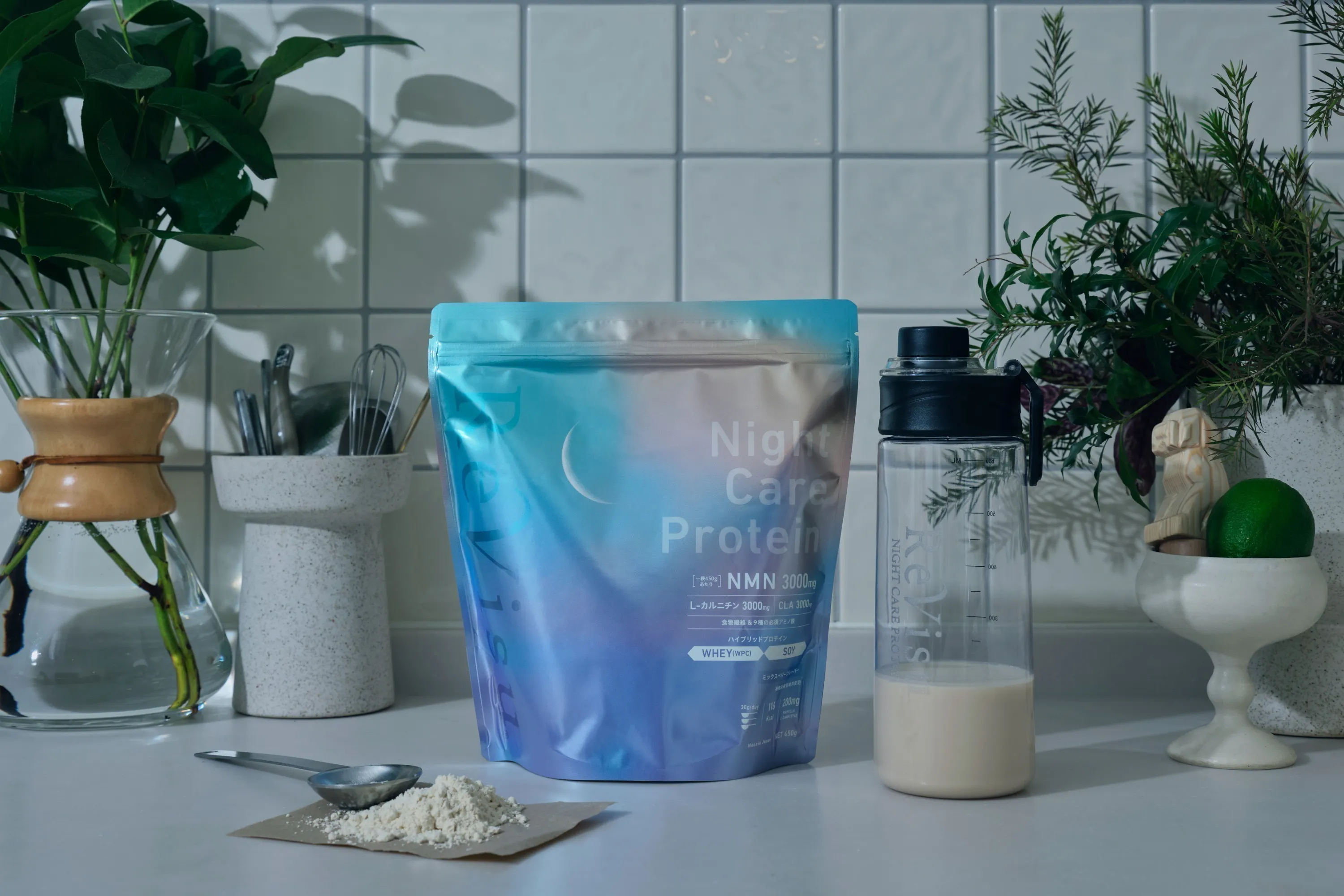 そこで開発したのが、**ホエイ&ソイのハイブリッドプロテイン「リビジュ」**です。