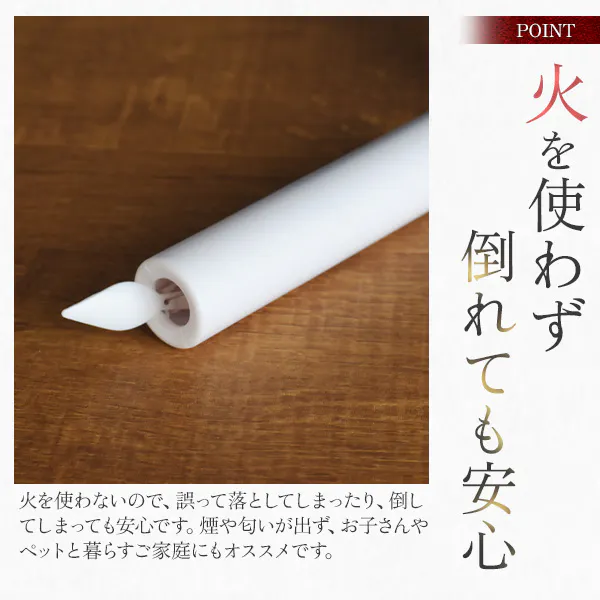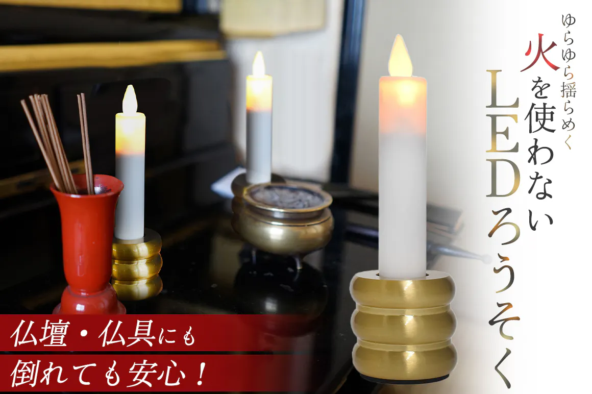 火を消し忘れて火事になる心配がなく安心して使用ができます。現代では、仏間を用意する場所が取れずに供え物や線香、火のついたろうそくなどを棚上に置いている場合があり危険です。安全面を考えると本製品は最適です。