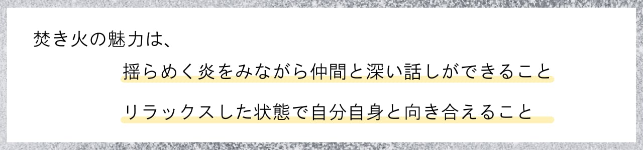 焚き火を囲むと、自然と会話が生まれたり、普段は話せないような深い話しができたりしますよね。