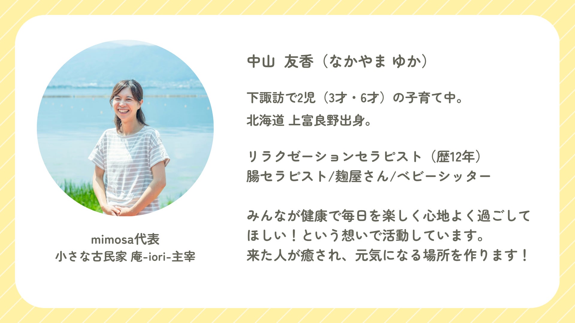 私(代表 中山友香)は長野県下諏訪町に 民泊&ボディケアサロン「小さな古民家 庵 -iori-」を運営しています。子連れでも安心して泊まれて、癒される場所をつくりたいという思いで2023年に開業しました。