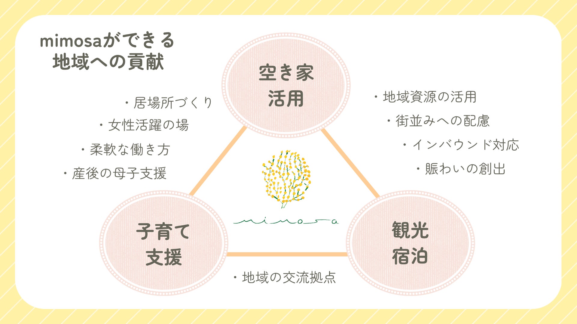 mimosaは 子どもにも大人にも優しい複合施設として、「空き家活用」「子育て支援」「観光」という多方面から地域を元気にしていきます。