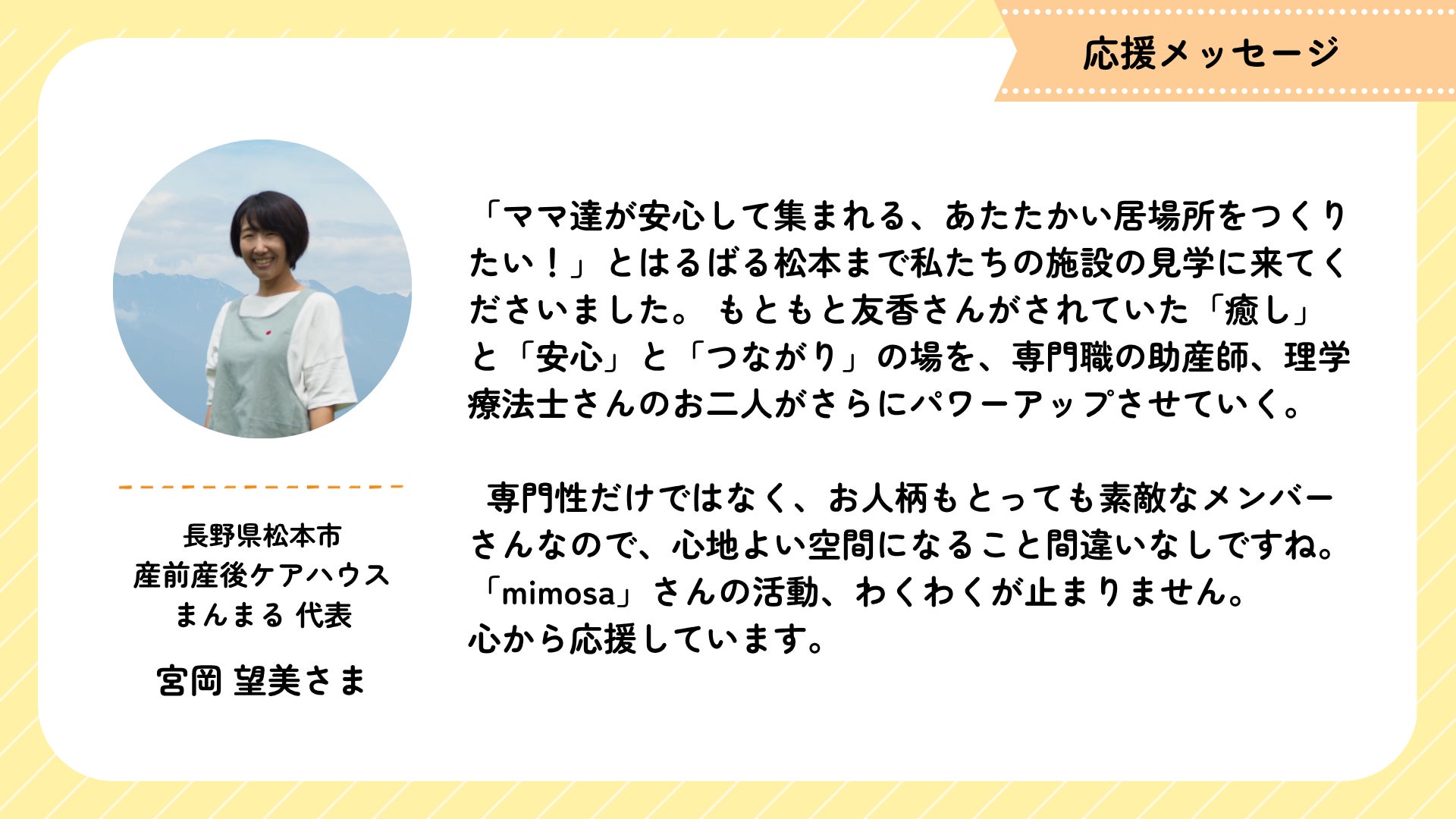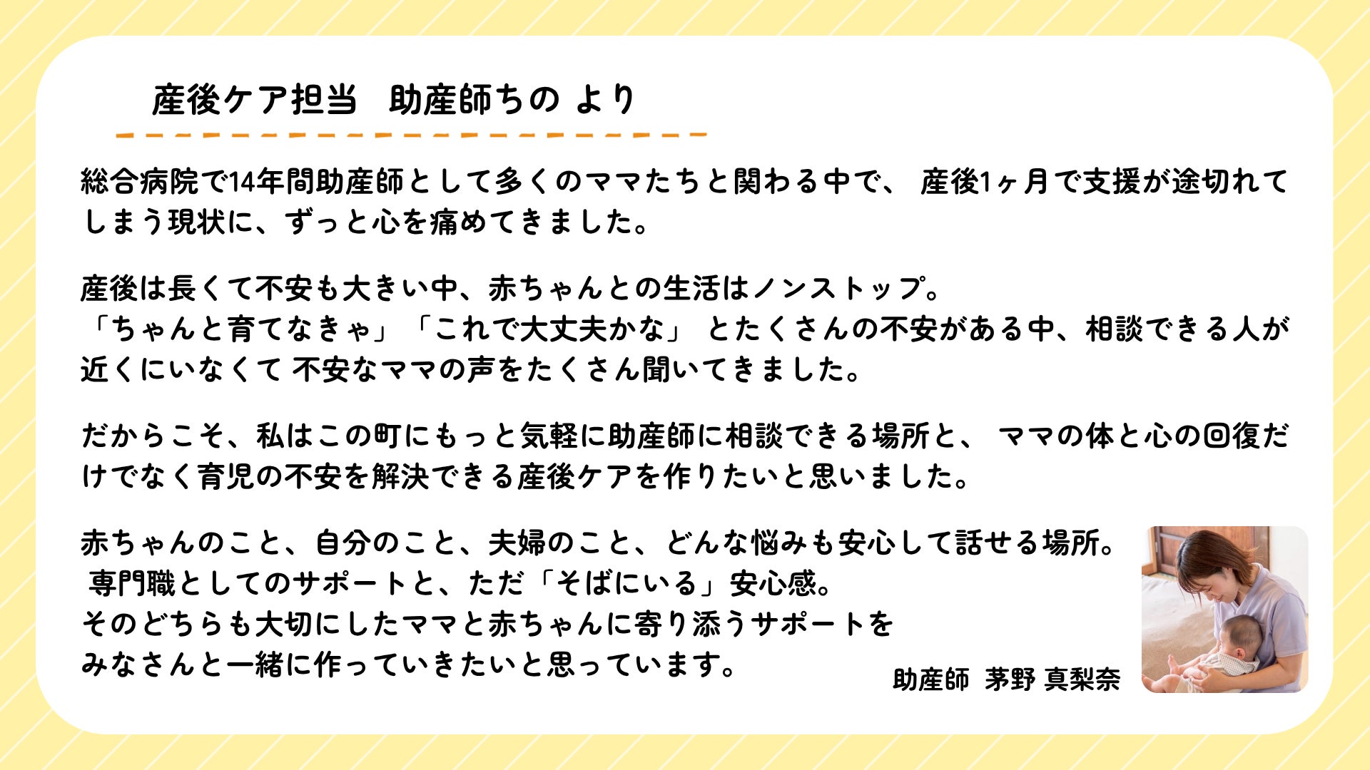 その他、サポートの助産師さん、保育士さん、現役ママさんにもご協力いただき運営する予定です。