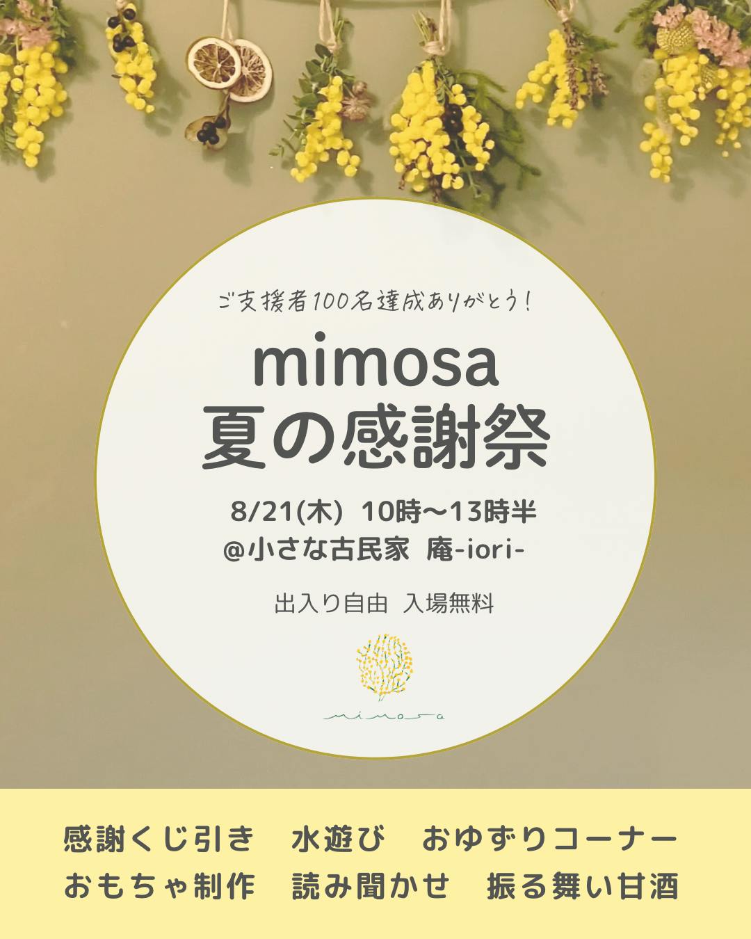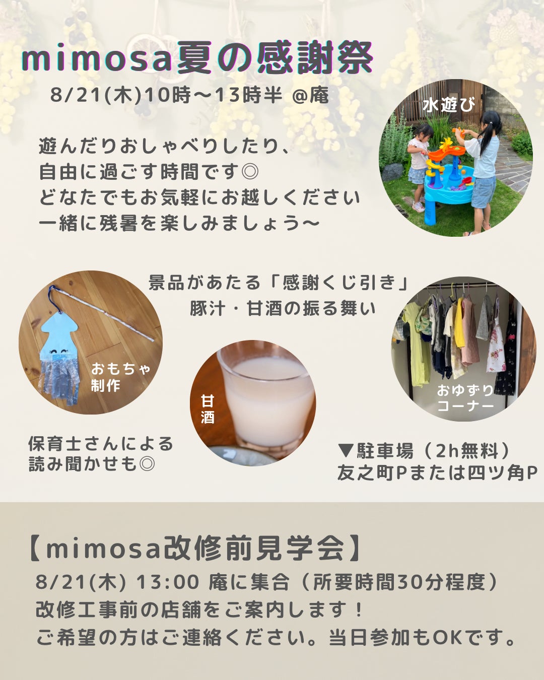 ご支援者100名様達成に感謝の気持ちを込めて、8/21(木)「mimosa夏の感謝祭」を開催します!