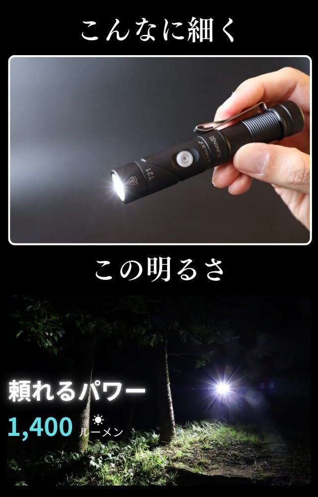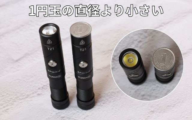 超小型LED懐中電灯『T21』。その特長のひとつが、コンパクトボディながら1400ルーメン×高輝度6500K(ケルビン)を実現した高性能LEDユニット。